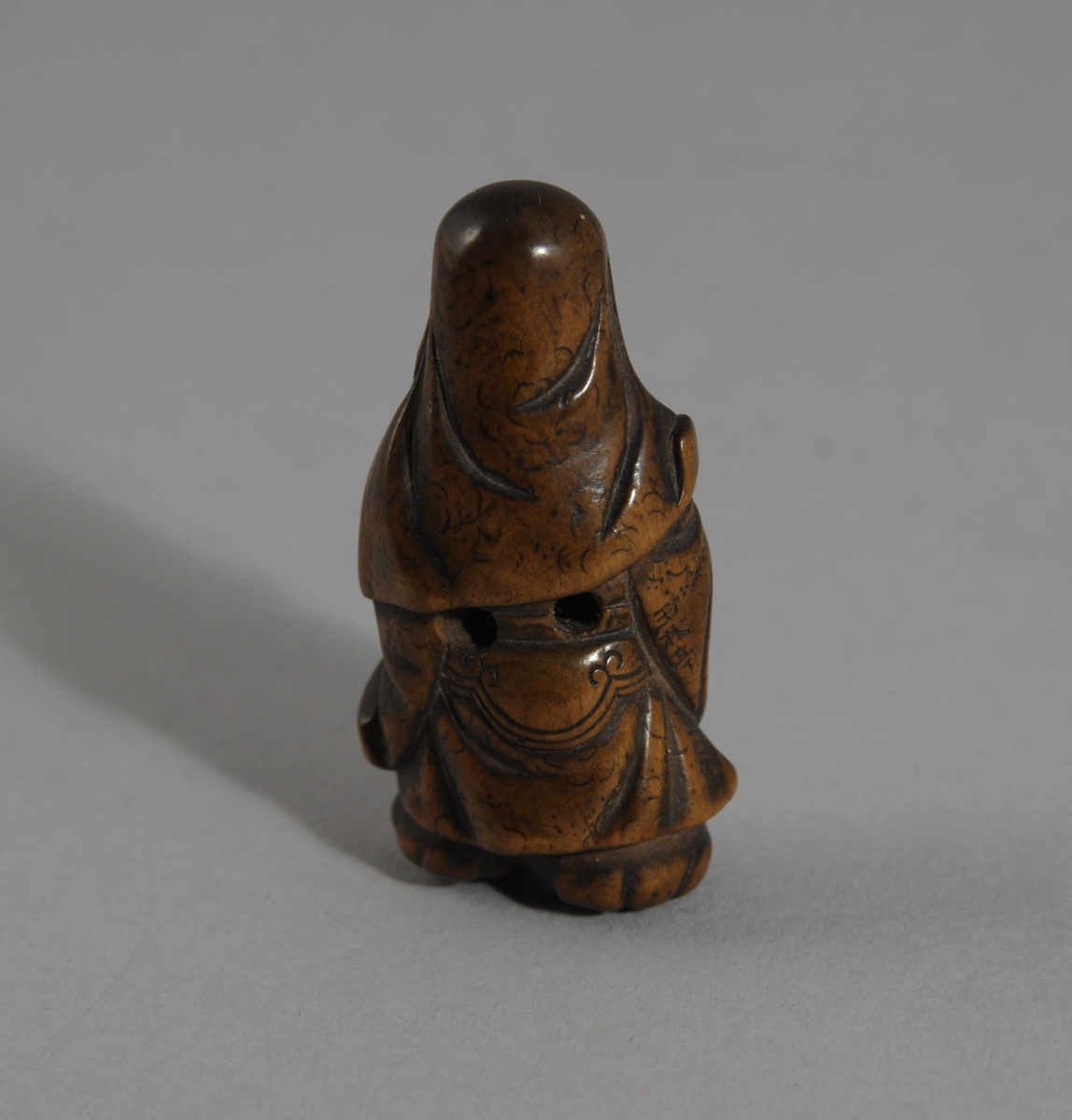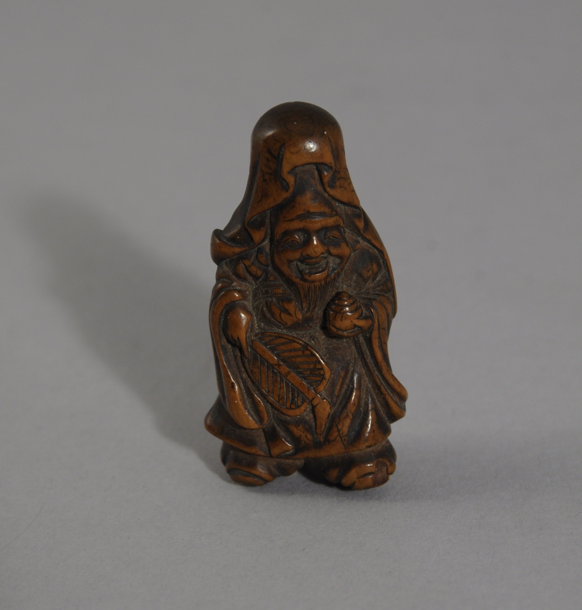 NETSUKE en buis pâtiné représentant un vieillard rieur tenant un écran à main. Japon, fin XIXème - Début XXème. Haut. 4,5, Larg. 2 cm.