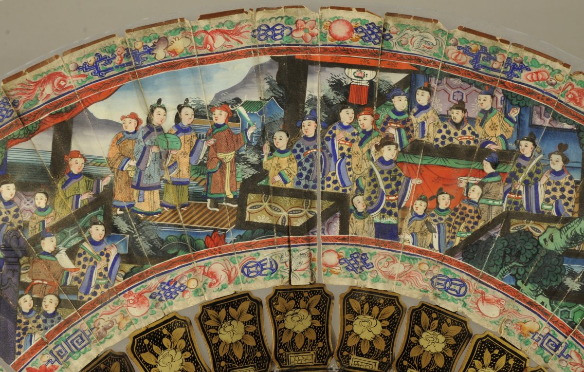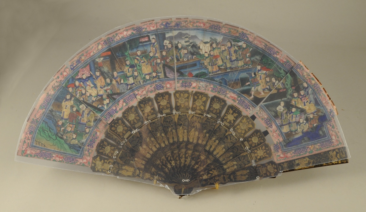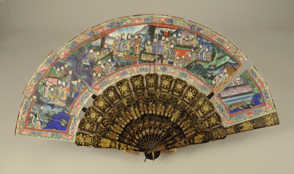 ÉVENTAIL en bois peint noir et or à l'imitation du laque de personnages dans un jardin et de fleurs. Feuillets à décor polychrome de scène de palais. Canton, XIXème. Haut. 28, Larg. 52 cm. (manque un feuillet)