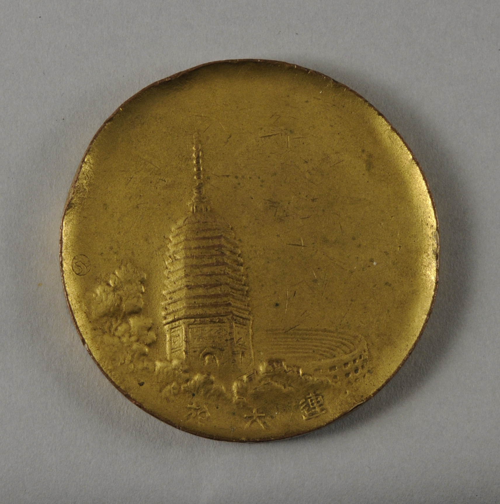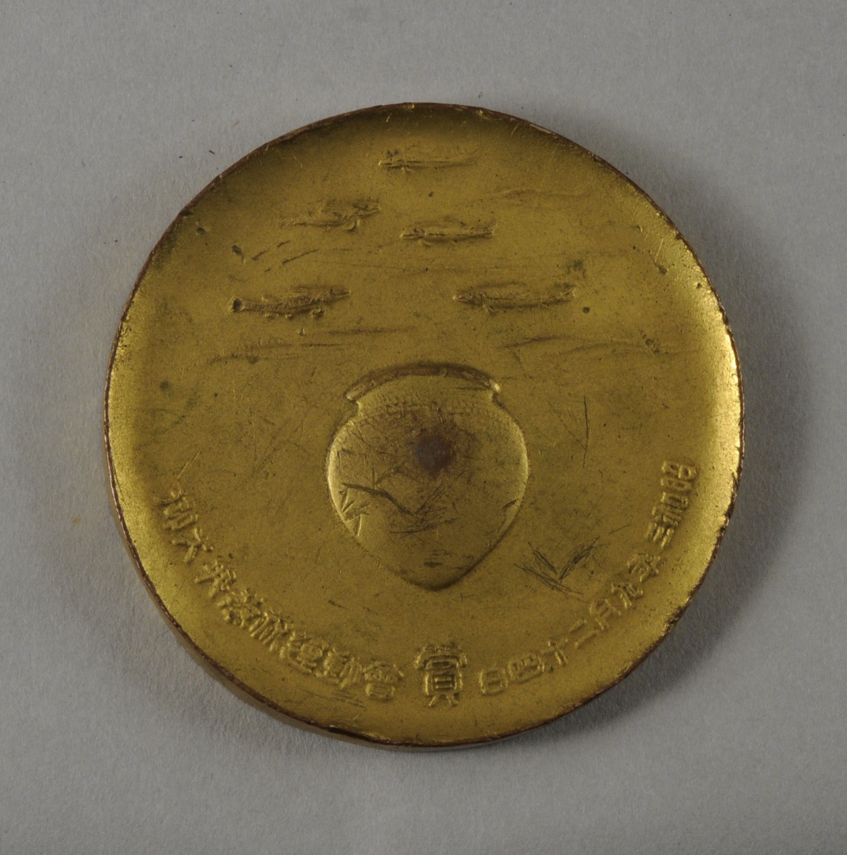 MÉDAILLE COMMEMORATIVE en bronze pâtiné célébrant une cérémonie sportive (?) dans la ville de Dalian (province de Liaoning), le 24 septembre 1928. CHINE. Diam. 7,5 cm.