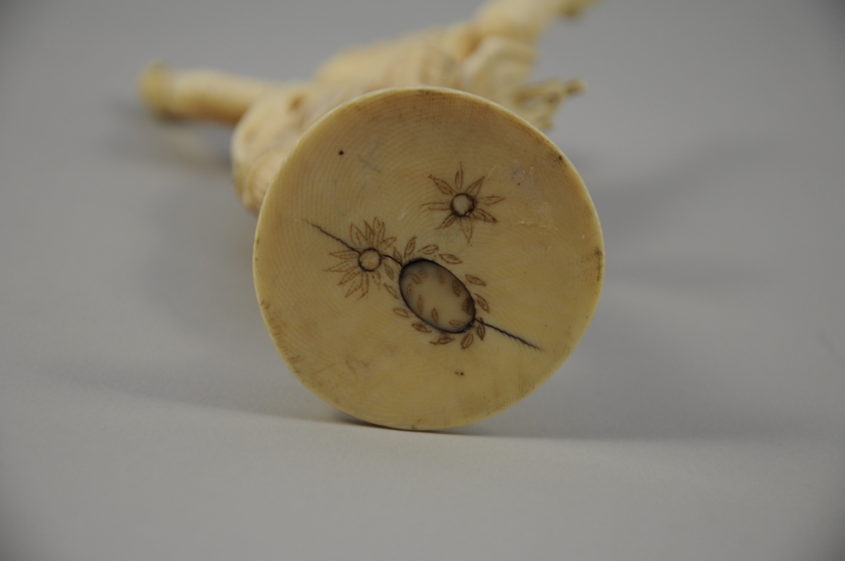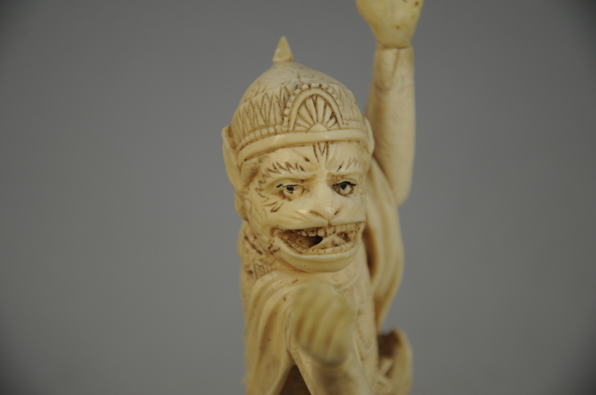 OKIMONO en ivoire à patine jaune, Hanuman debout, la jambe gauche posée sur un rocher.