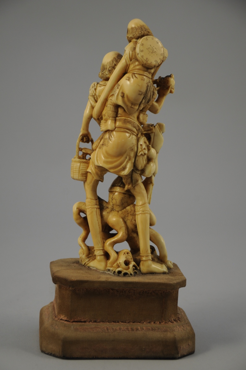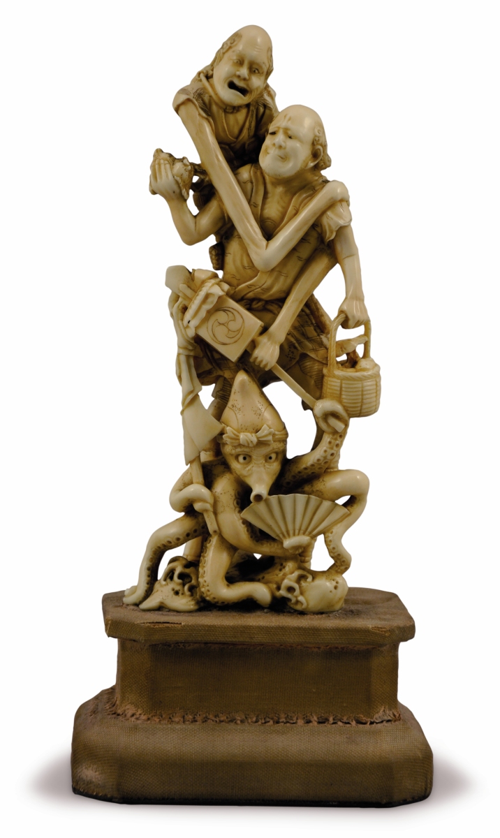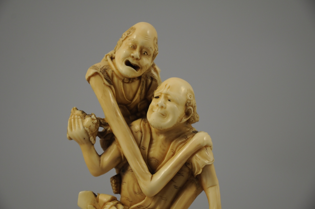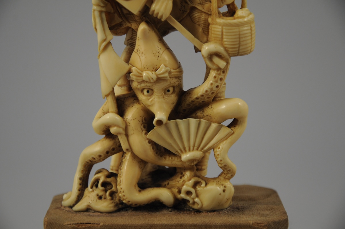 OKIMONO en ivoire à patine jaune, représentant Ashinaga et Tenaga debout sur une pieuvre déguisée en danseuse de Sambaso. Japon, XIXème. Haut.18 cm.
