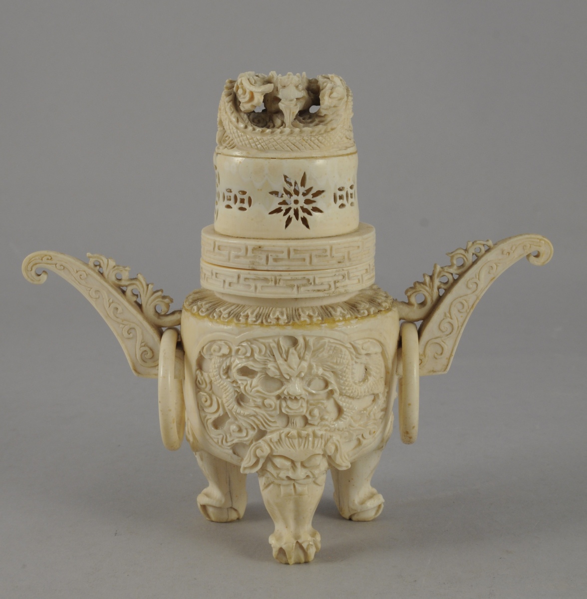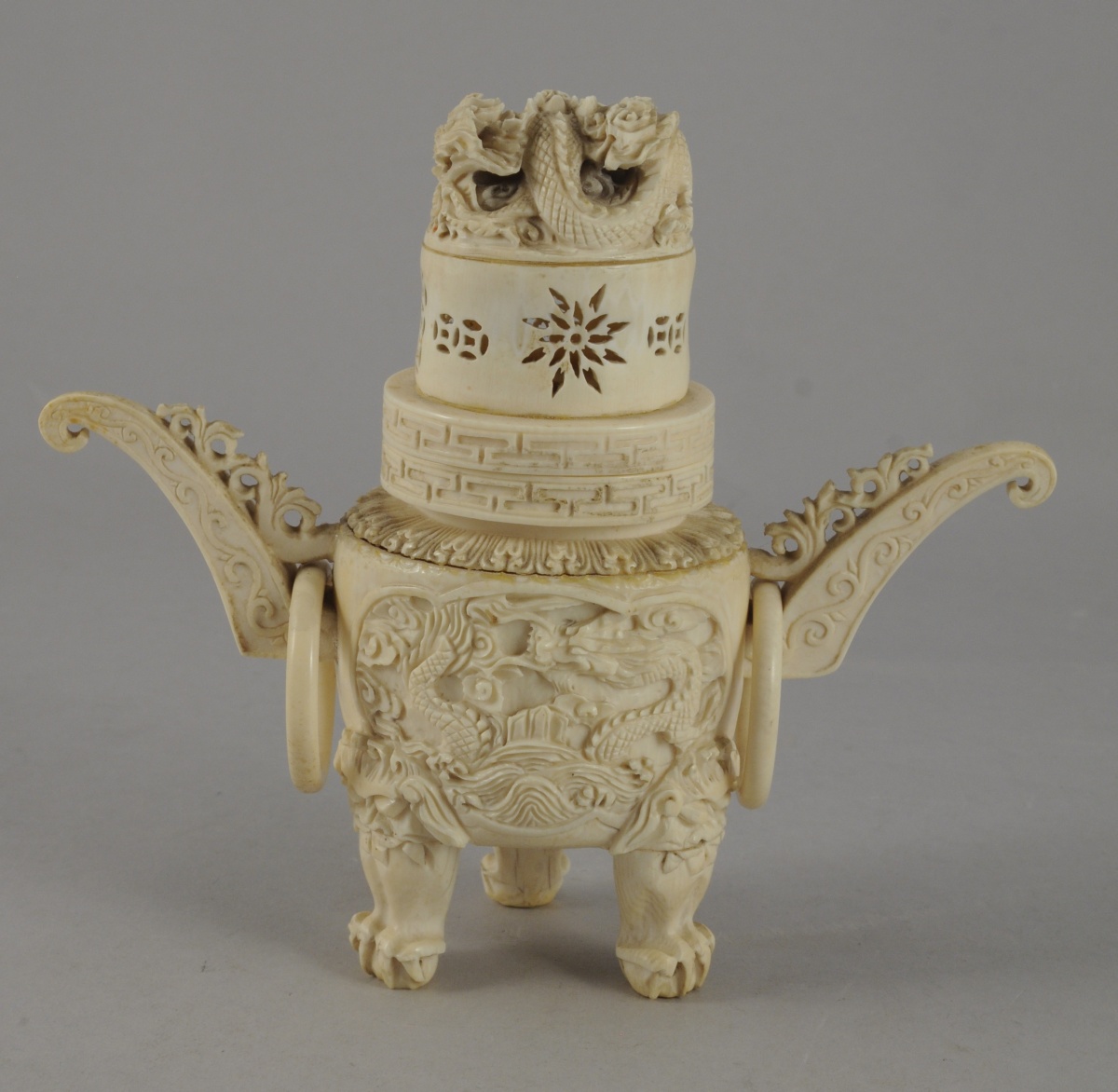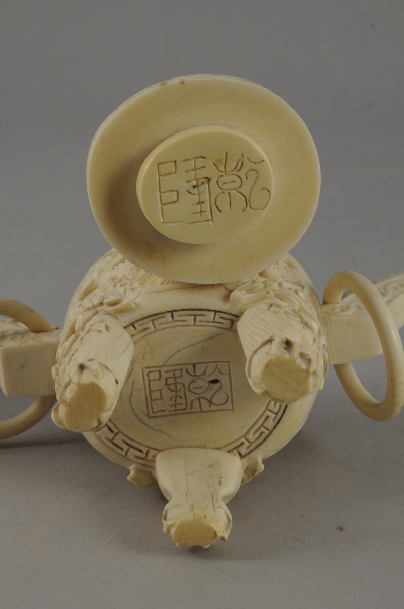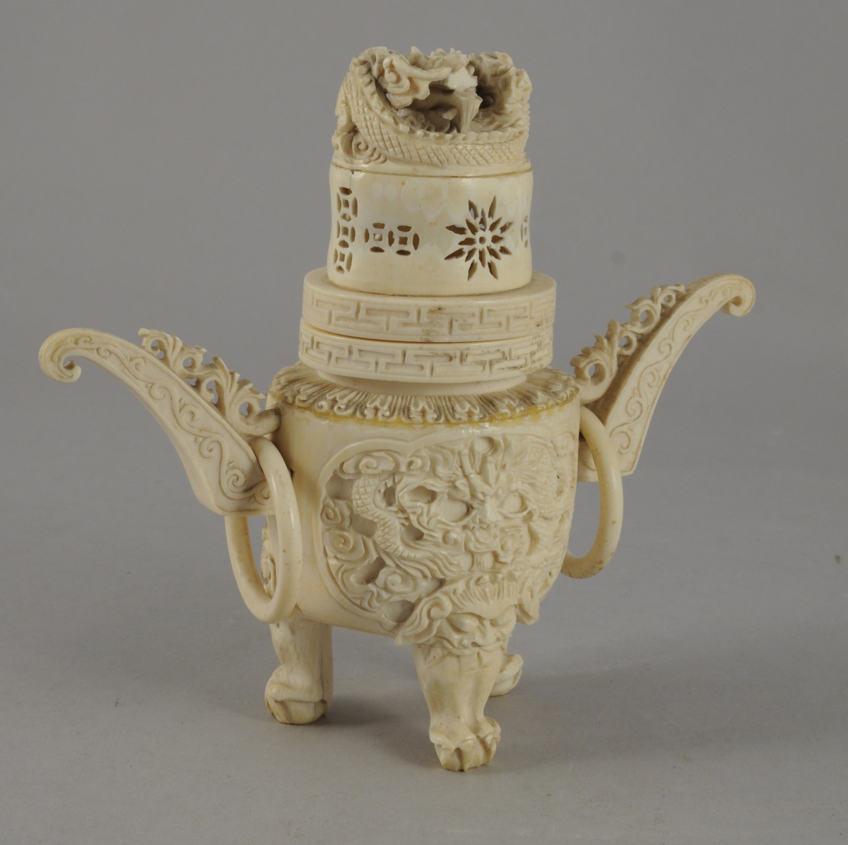 Petit POT COUVERT en ivoire, en forme de brûle-parfum. Pieds en forme de pattes griffues et ornés de masques de taotie. Panse à décor en creux de dragons poursuivant la perle sacrée. Couvercle à décor ajouré, et surmonté d'un dragon. De part et d'autre, anses avec anneaux mobiles. Signé.