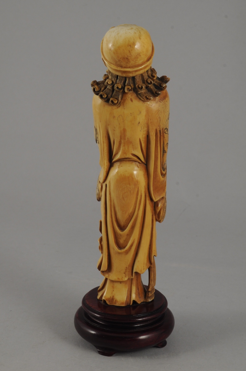 STATUETTE en ivoire à pâtine jaune, l'immortel Li Tieguai debout portant un bateau et une gourde. Chine, XXème siècle. Socle rond en bois teinté. Haut. 20,4 cm. (l'index et le pouce du pied gauche accidentés).