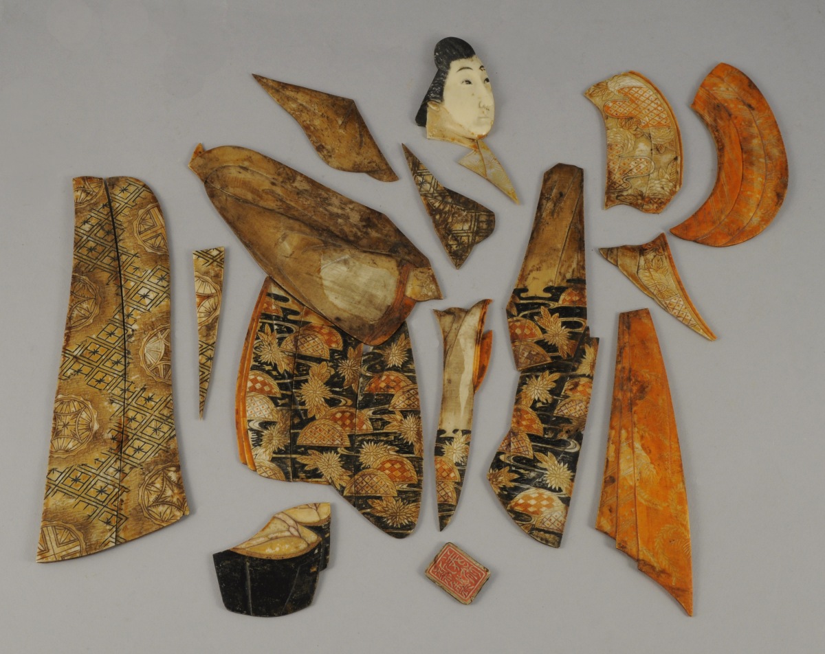 RÉUNION DE 21 PLAQUES en os, ivoire ou nacre gravées et teintées figurant notamment quadrillages, plis de kimono, rivière, tête humaine et cartouche avec inscriptions. Japon ? XIXème. Devaient former un bas-relief.