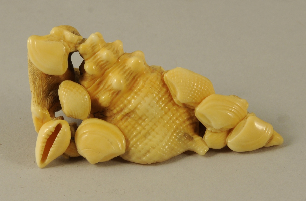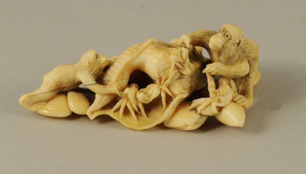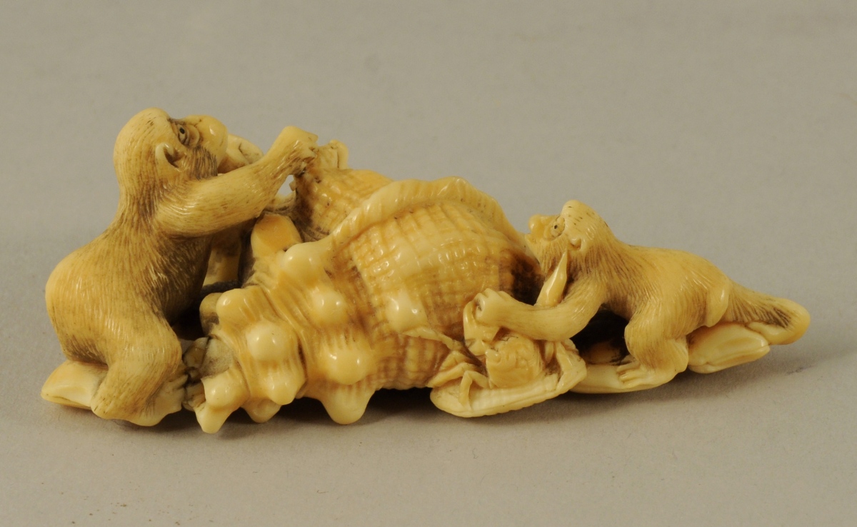 NETSUKE en ivoire sculpté figurant des singes pêchant des crabes dans un coquillage. La base ornées de bivalves. Japon, XIXème ? Haut. 3, Larg. 8, Prof. 4,5 cm.