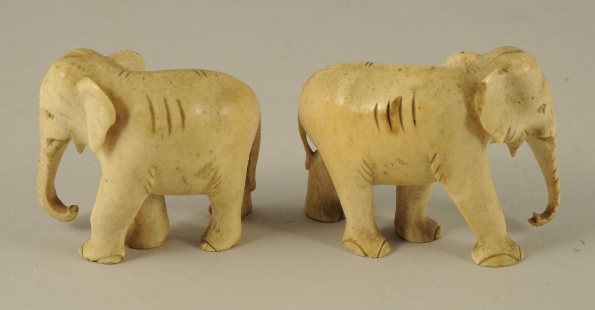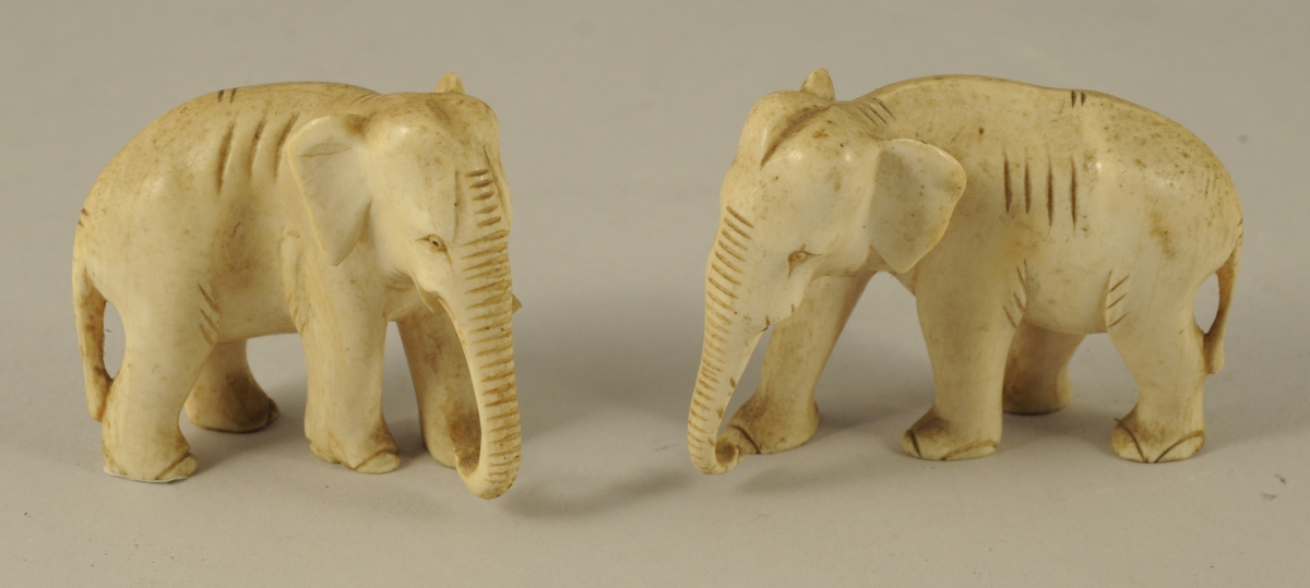 DEUX ÉLÉPHANTS en ivoire sculpté. Haut. 6, Long. 7 cm. (manque les défenses)