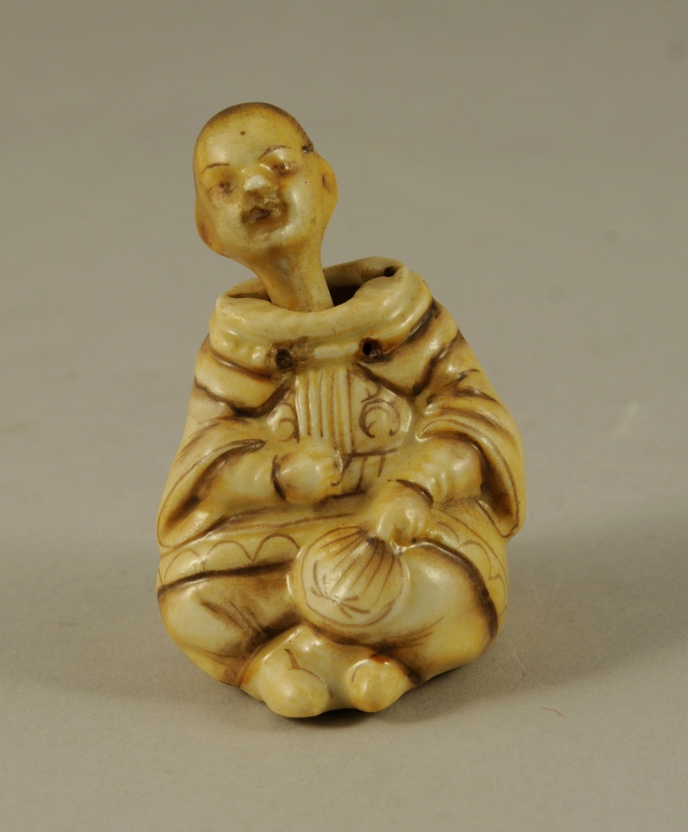 JOINT : SUJET à tête mobile en porcelaine figurant une chinoise assise tenant dans une main un éventail. Émail à l'imitation de l'ivoire patiné.