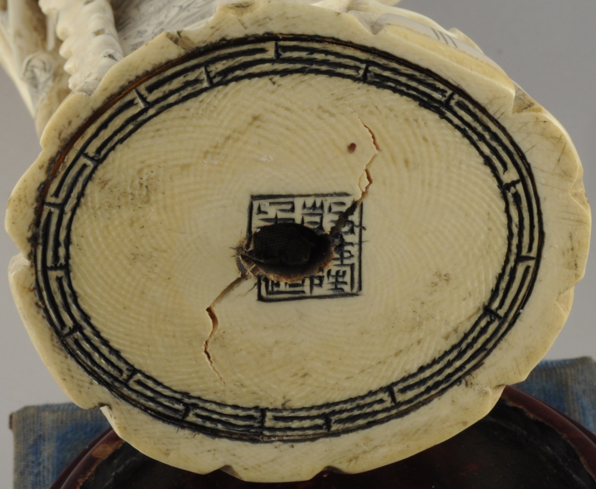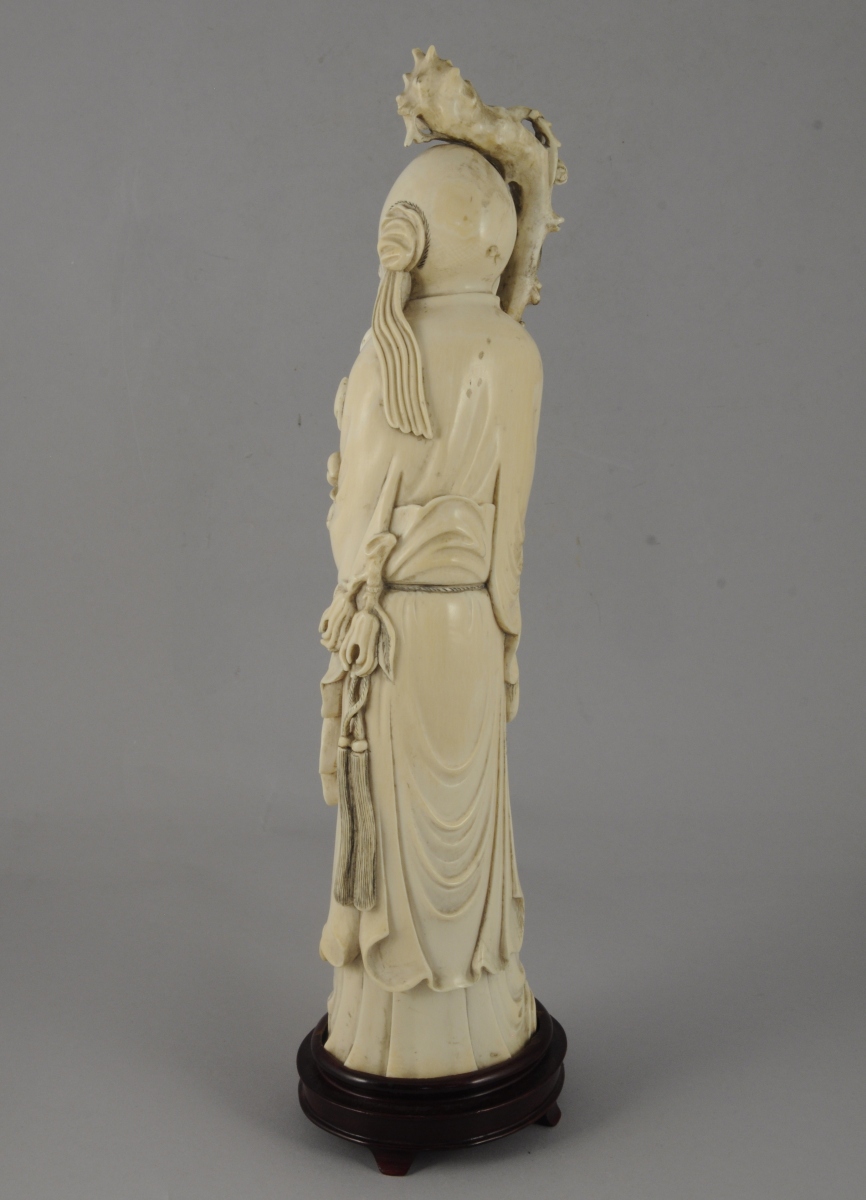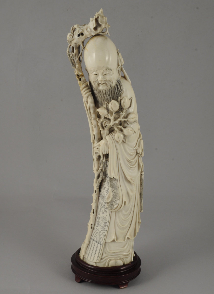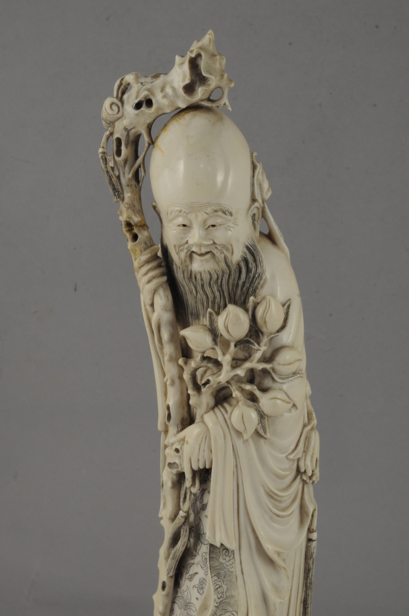 SUJET en ivoire figurant Shou Lao appuyé sur son bâton. Signé. Socle en bois. Chine, XXème. Haut. 40 cm. (petits accidents, bâton cassé et recollé).