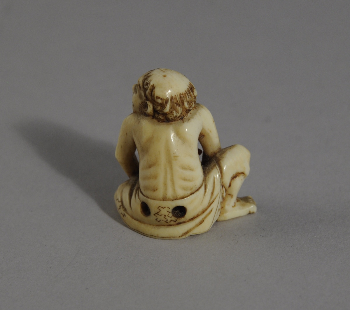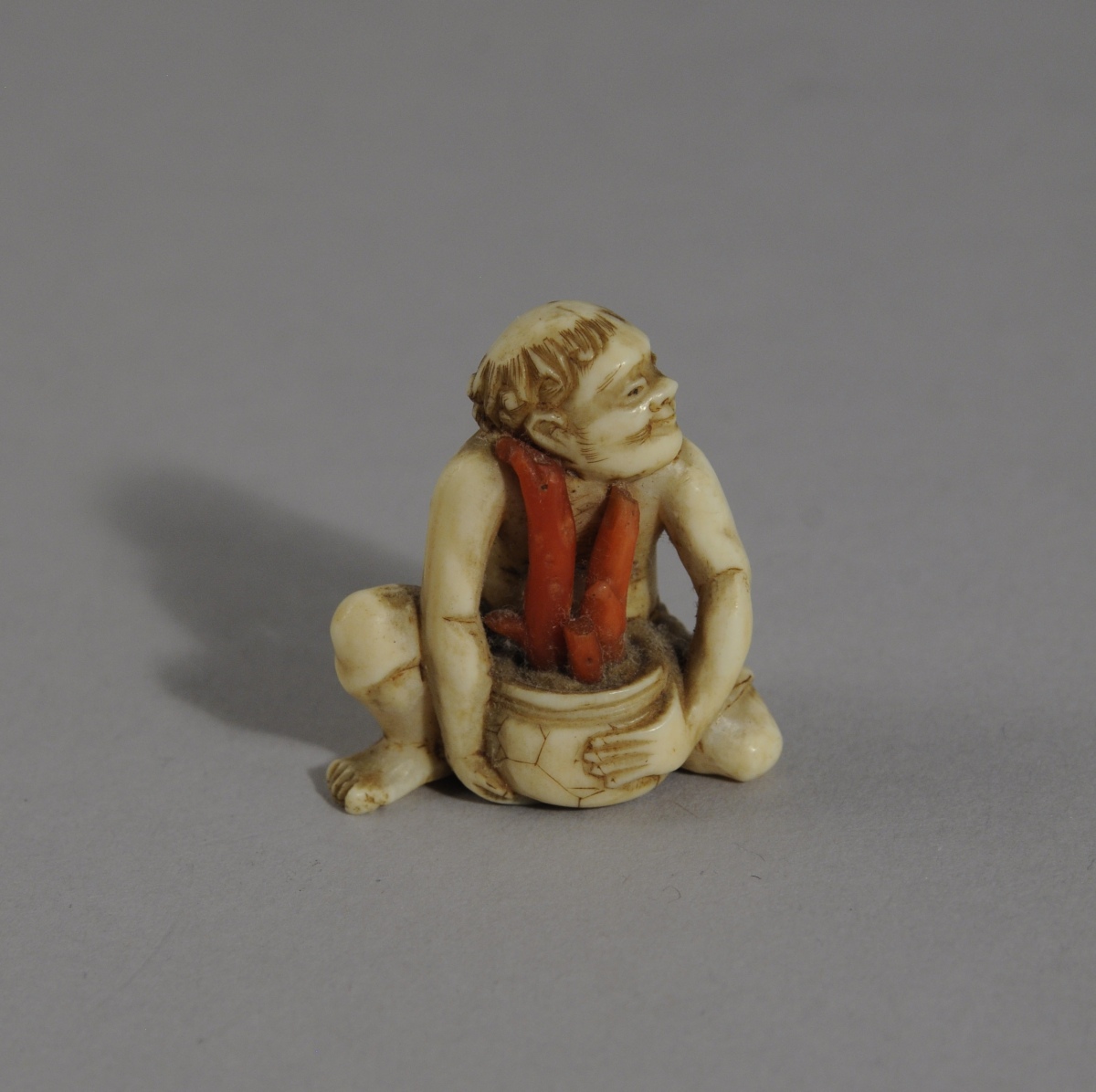 NETSUKE en ivoire représentant un homme accroupi tenant un vase contenant une plante rouge (corail ?). Japon. Caractères japonais sur le dessous. Fin XIXème - Début XXème. Haut. 3, Larg. 2,5 cm.