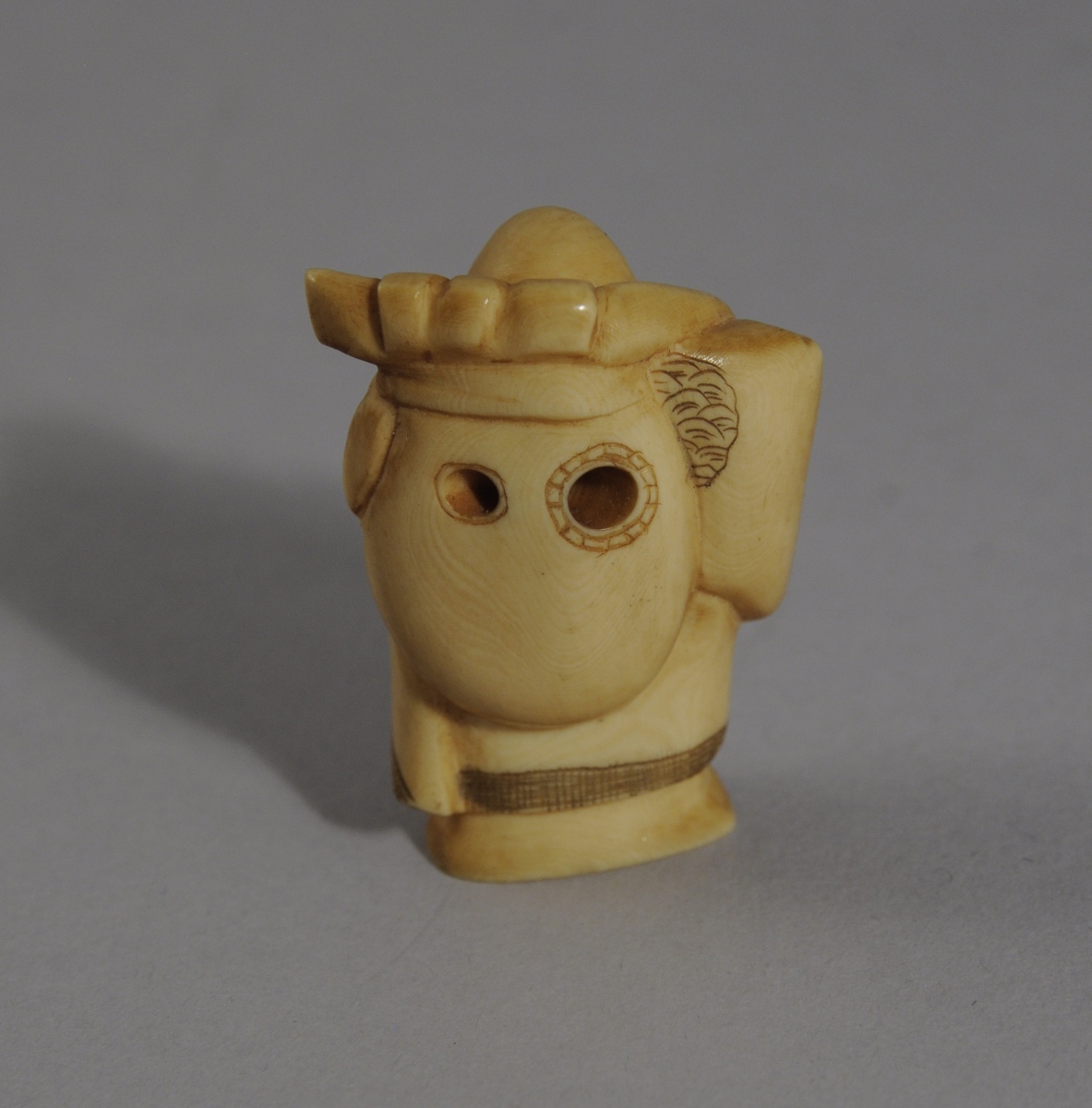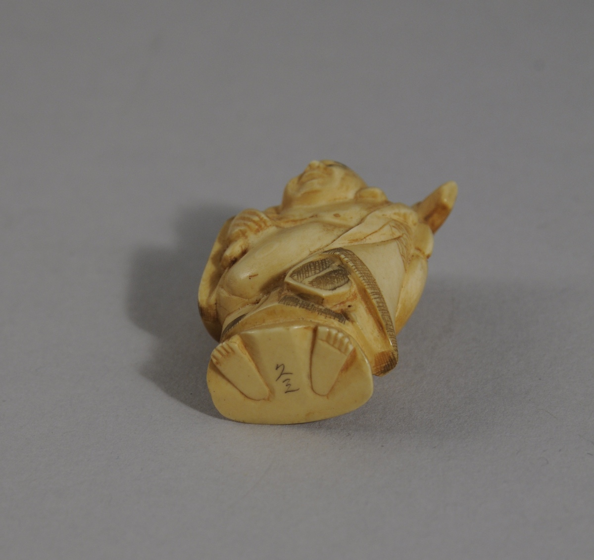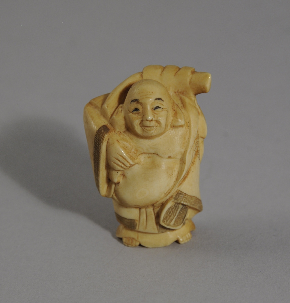 NETSUKE en ivoire représentant un homme ventru portant une charge sur son dos. Japon. Caractères japonais sur le dessous. Fin XIXème - Début XXème. Haut. 4, Larg. 3 cm.