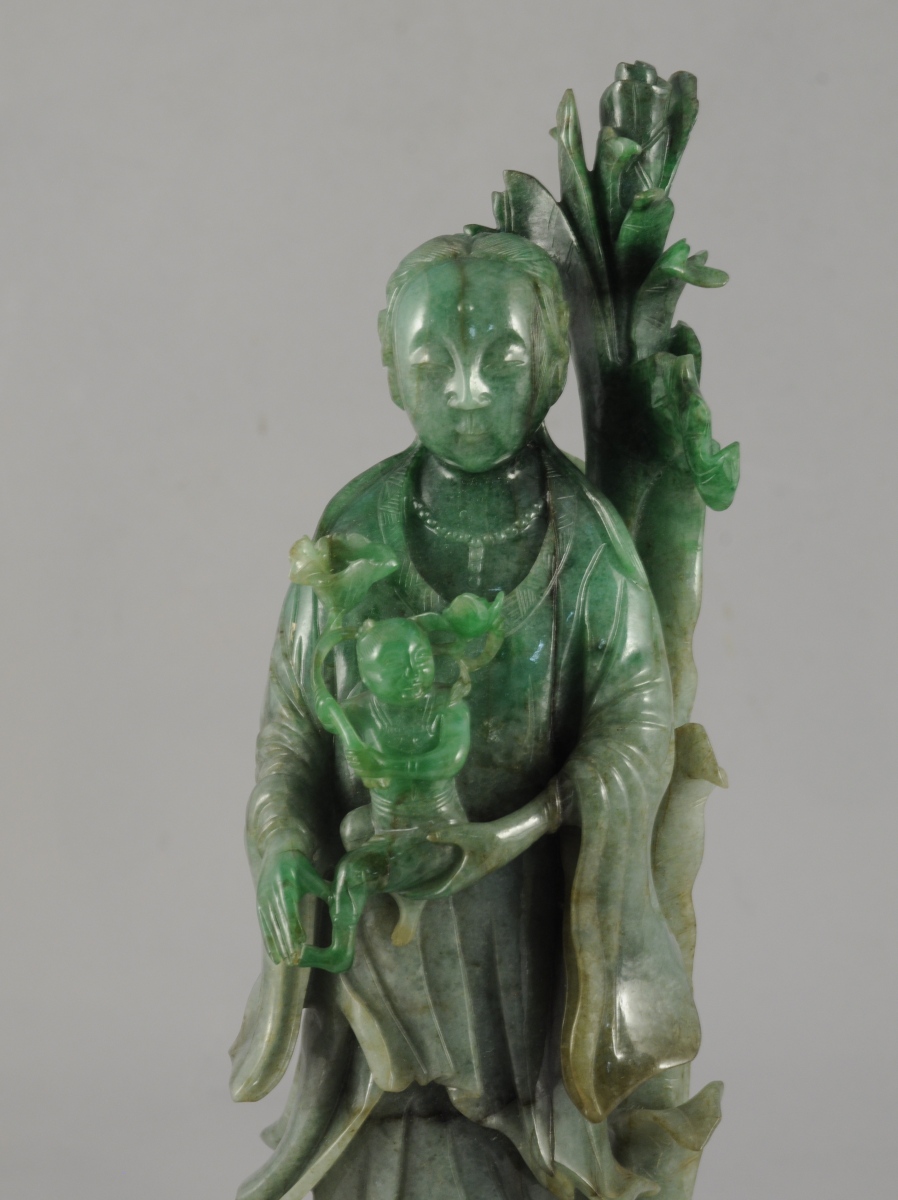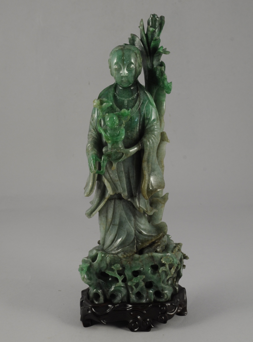 STATUETTE en jade représentant un personnage portant un enfant. Dans une boîte en bois. Chine, XXème. Haut. 31 cm.