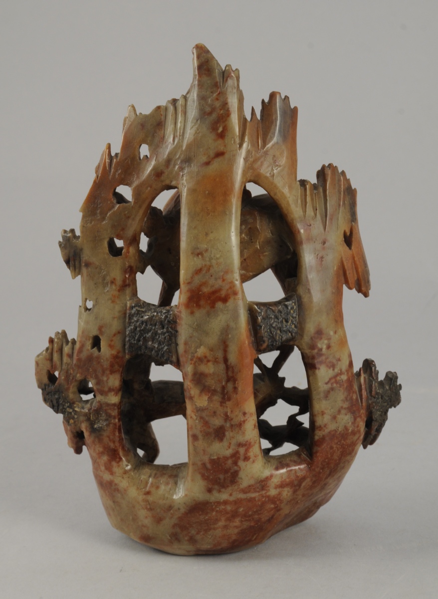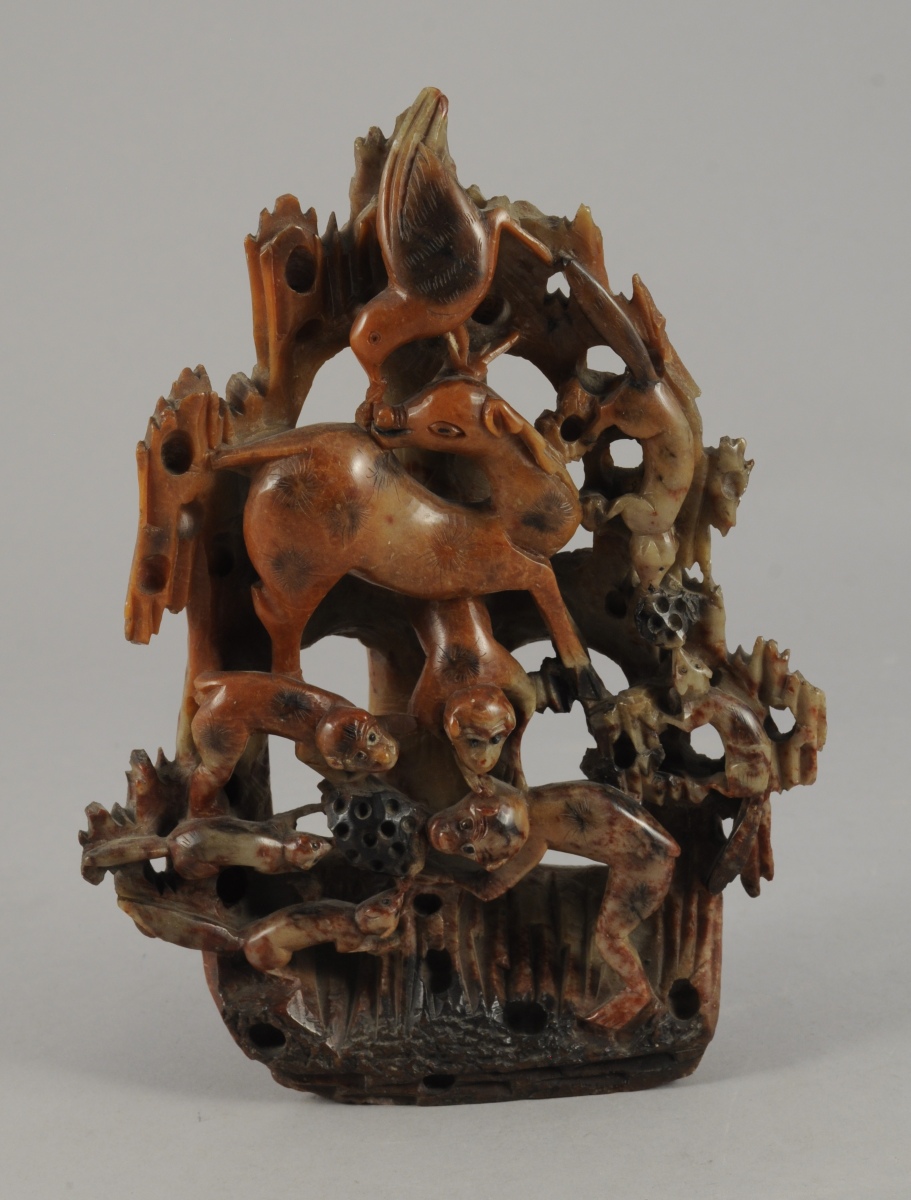 GROUPE sculpté en stéatite, figurant des singes, des oiseaux et un chevreuil se disputant de la nourriture. Chine, début XXème. Haut. 21 cm.