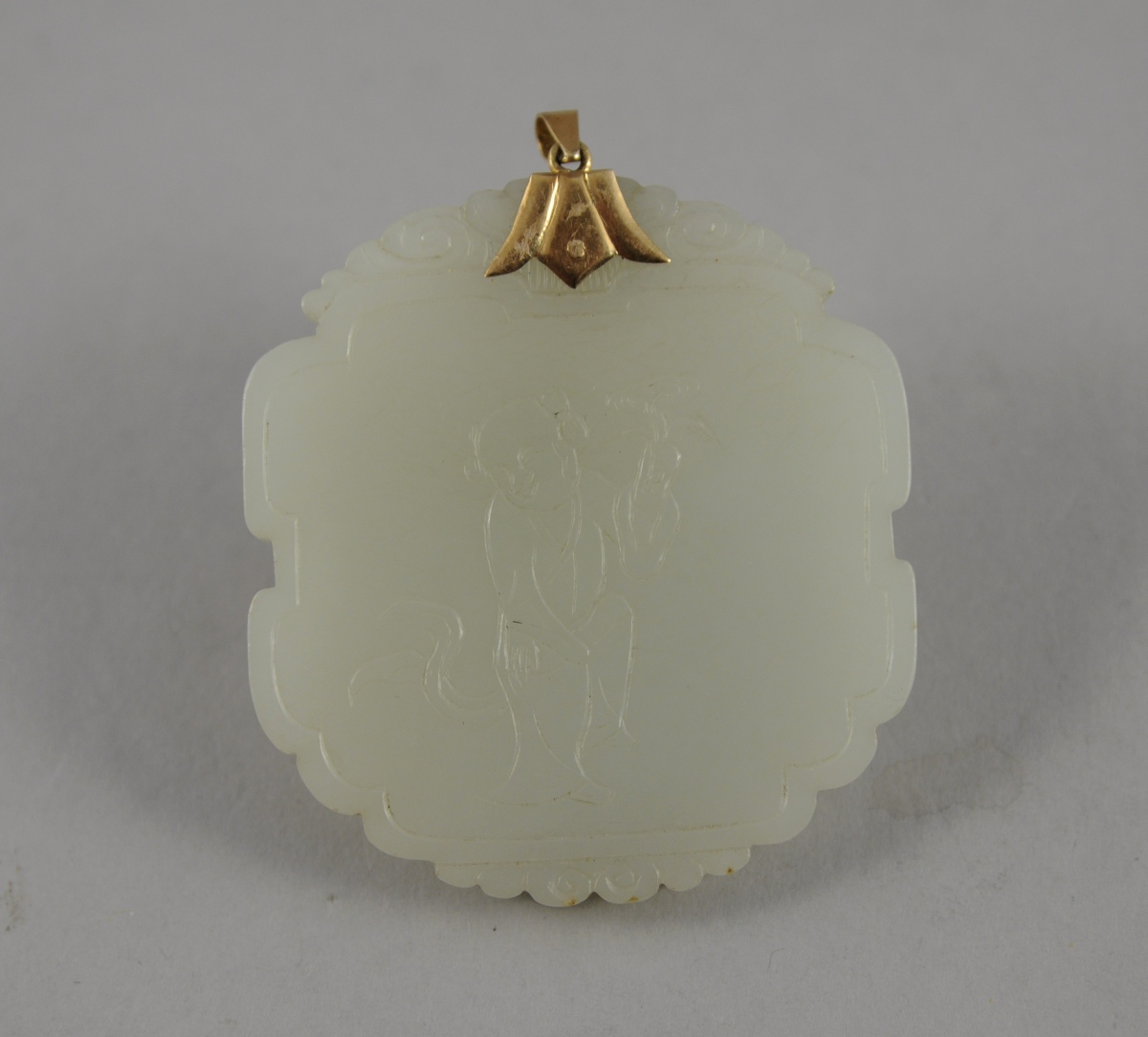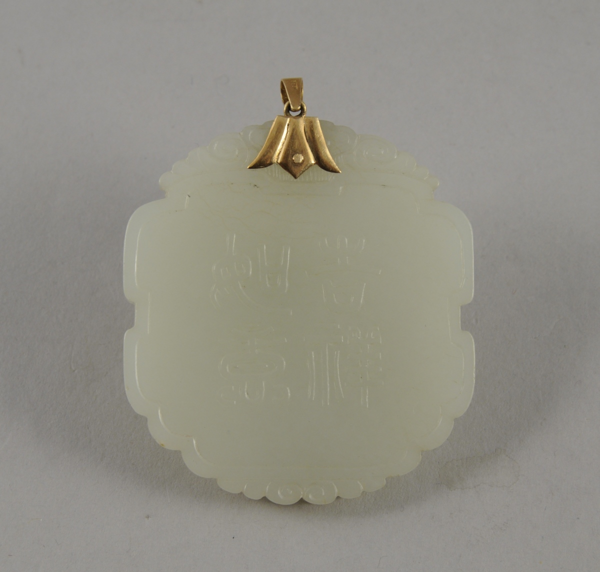 PENDENTIF PORTE-BONHEUR pour la naissance d'un nouvel enfant, en néphrite peau de lapin gravé d'un côté d'un personnage tenant une fleur de lotus et de l'autre des caractères du bonheur et de la prospérité. Chine XIXème. Monture en or. Larg. 5,5 cm.