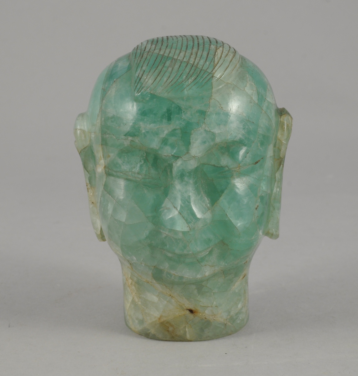 TÊTE souriante sculptée en fluorine. Chine, fin XIXème-début XXème. Haut. 12,3 cm.