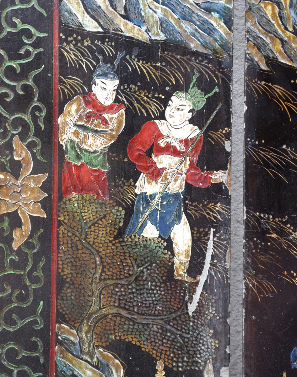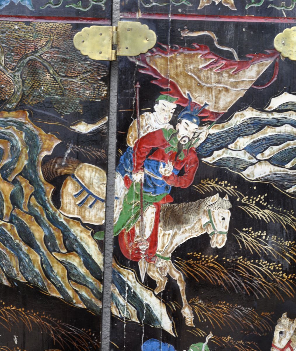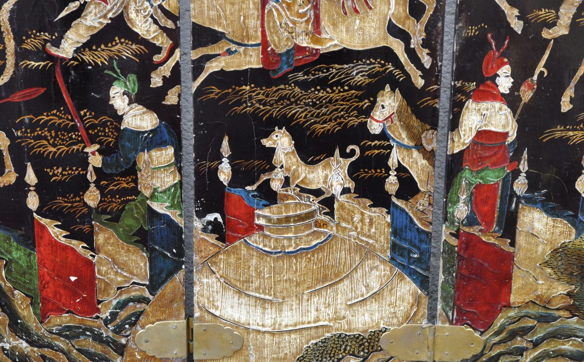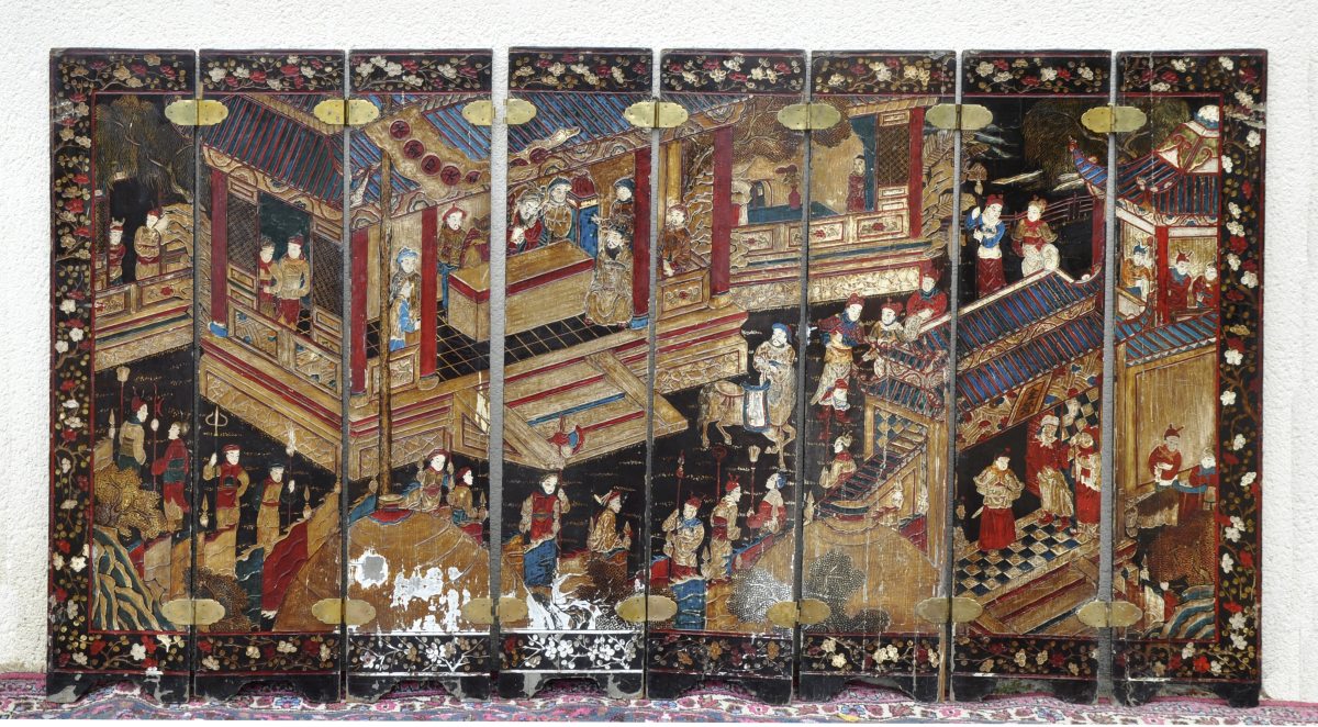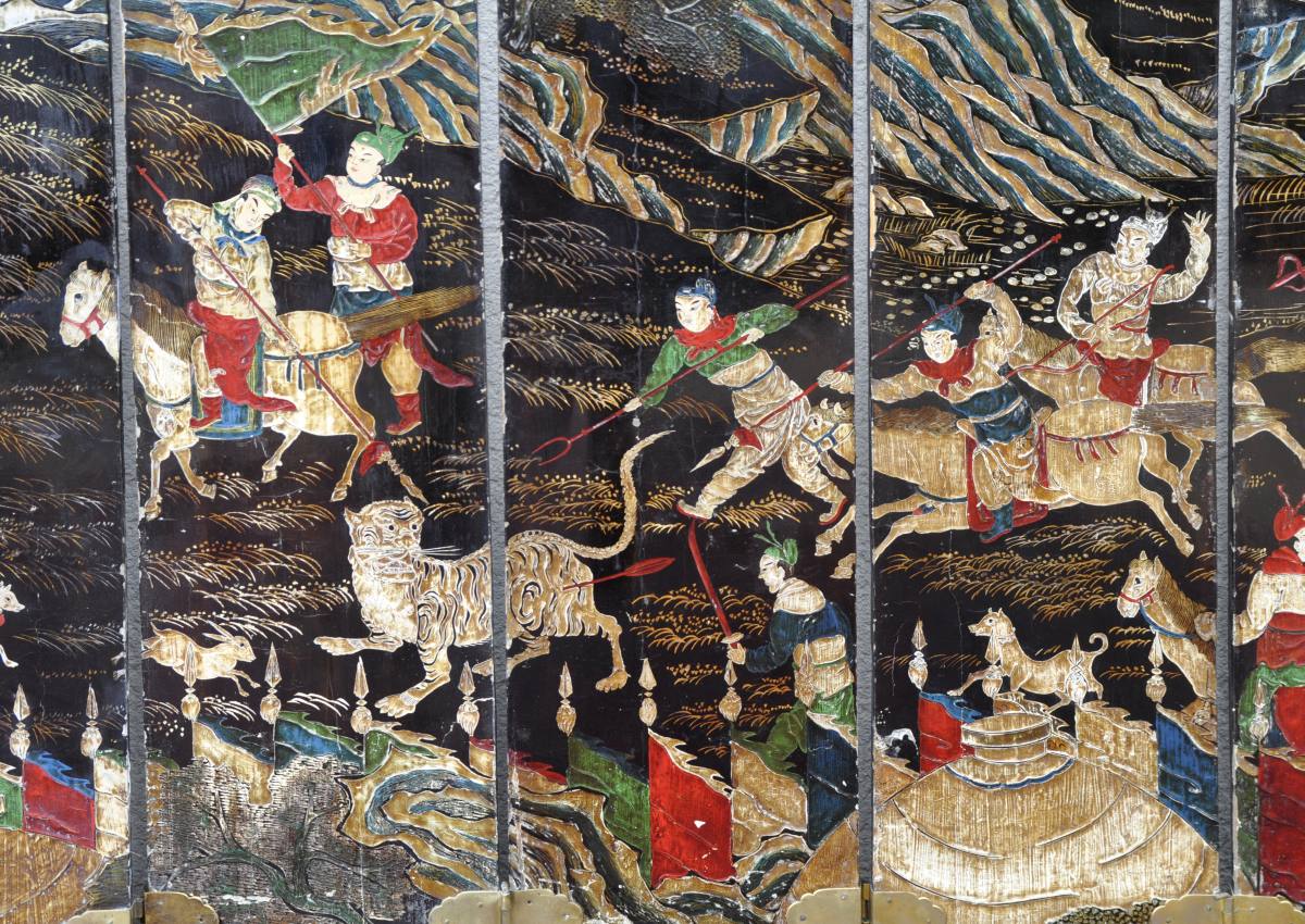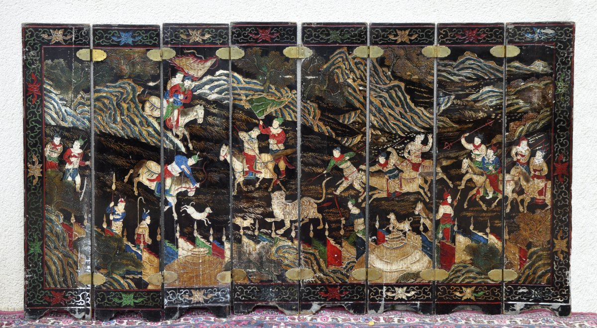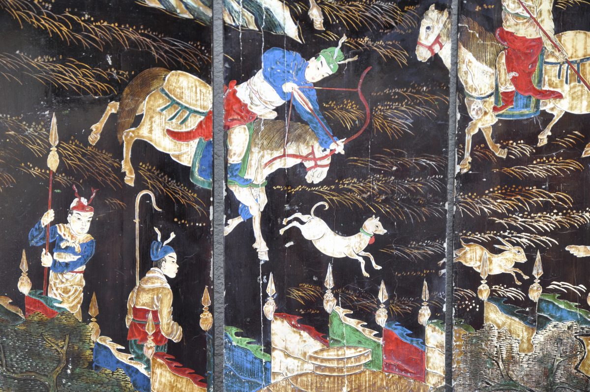 PARAVENT à huit feuilles double face peint à l'imitation du laque. Décor sur une face de scènes de palais dans un encadrement de branches de cerisiers en fleurs, et sur l'autre face de scènes de chasse dans un encadrement de fleurs de lotus et branchages stylisés. Chine, XIXème. Haut. 118, Larg. 214 cm. (accidents, manques)