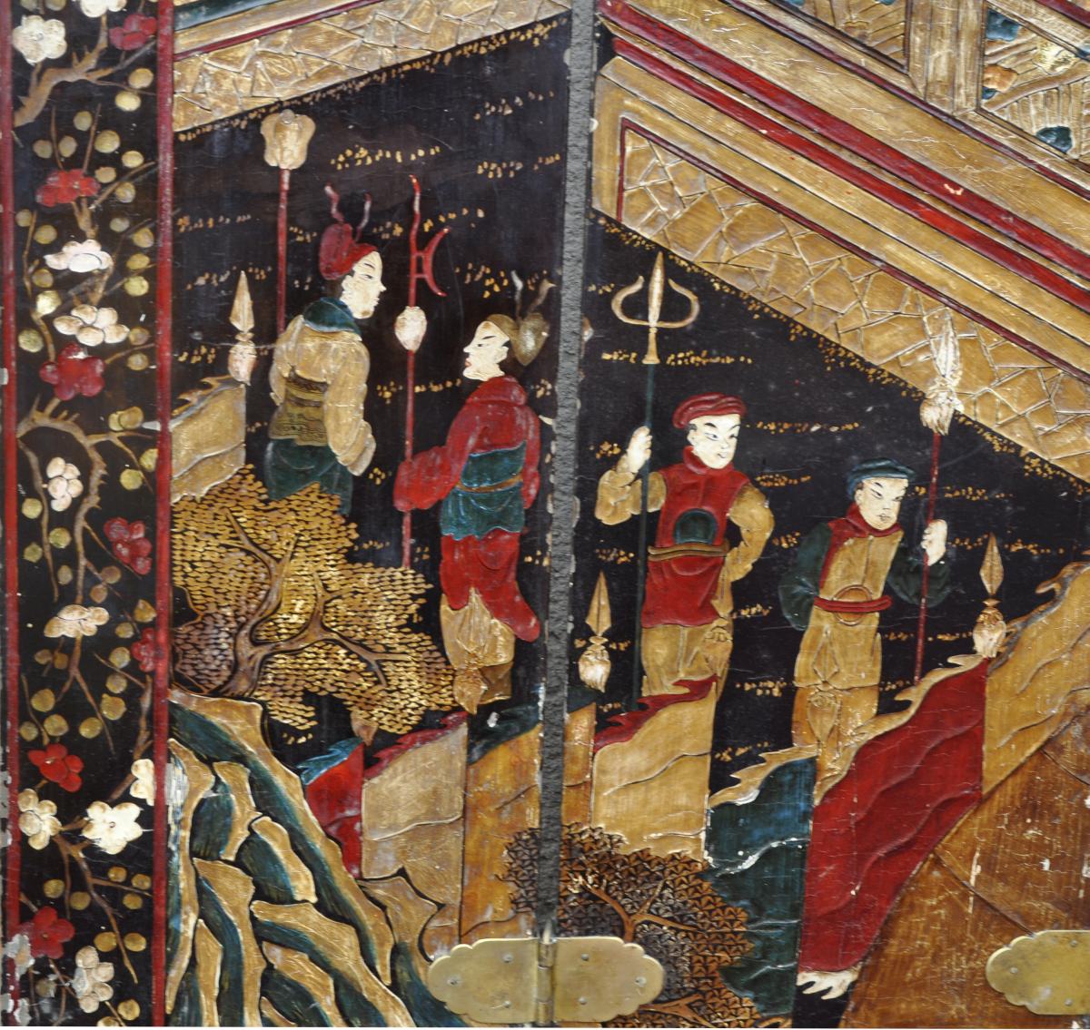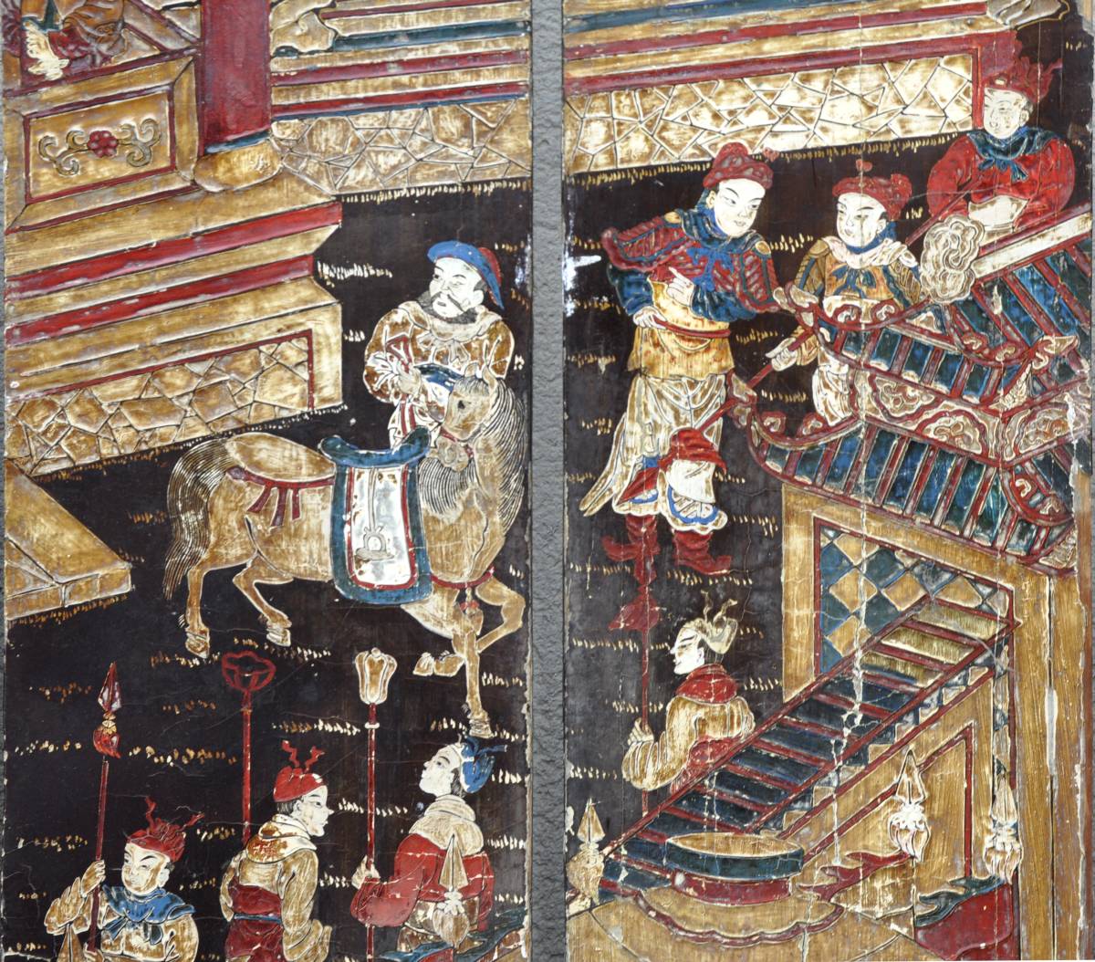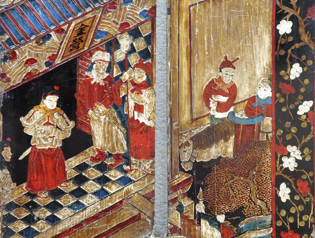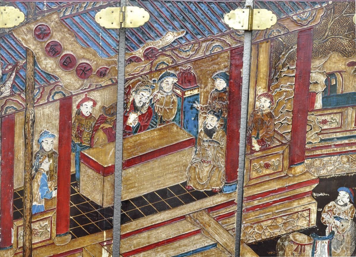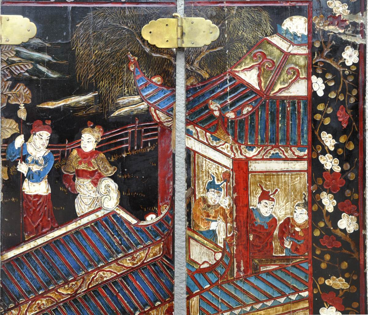PARAVENT à huit feuilles double face peint à l'imitation du laque. Décor sur une face de scènes de palais dans un encadrement de branches de cerisiers en fleurs, et sur l'autre face de scènes de chasse dans un encadrement de fleurs de lotus et branchages stylisés. Chine, XIXème. Haut. 118, Larg. 214 cm. (accidents, manques)