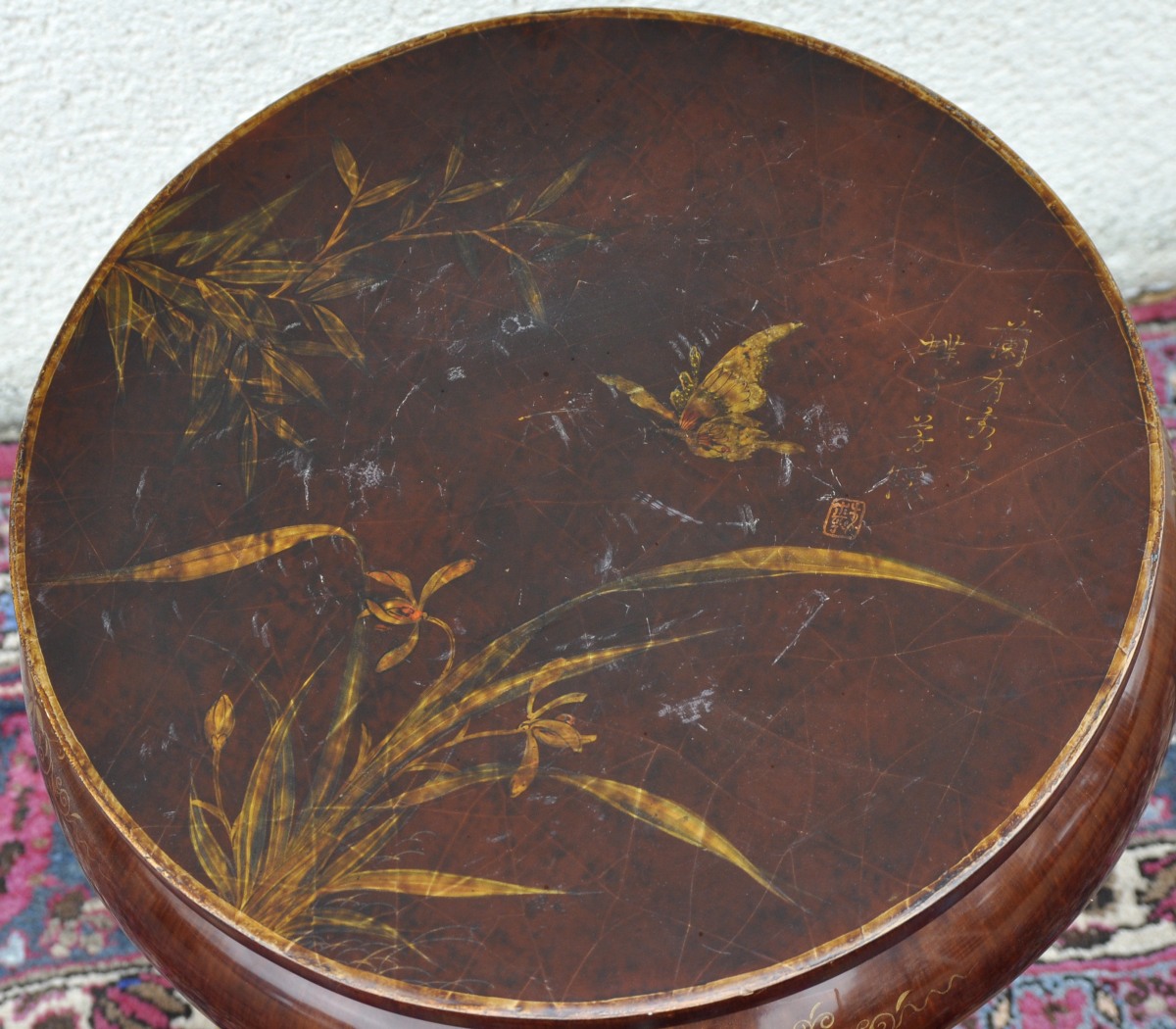 GUÉRIDON tripode en bois peint à l'imitation du laque. Plateau circulaire à décor d'un oiseau entouré d'iris d'eau et de bambous, il porte une inscription en caractère chinois et un sceau. La ceinture à décor de fleurs, rinceaux et filets. Pieds légèrement cambrés. XXème. Haut. 46, Diam. 40 cm.