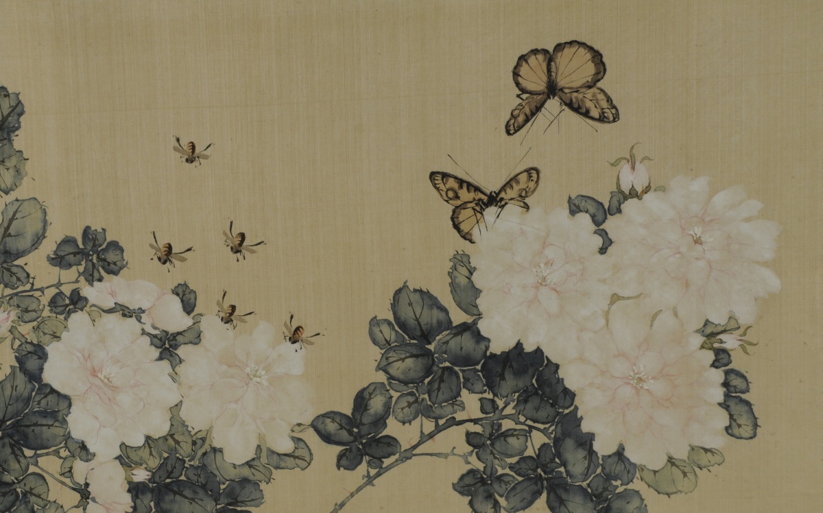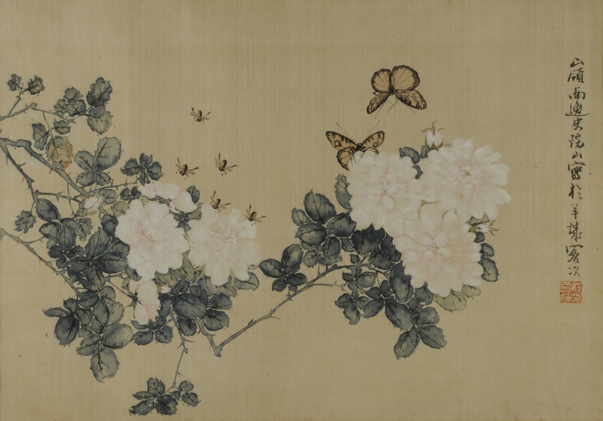 PAGE D'ALBUM à décor polychrome peint sur soie représentant des pivoines et des insectes. Chine, XIXème. 43 x 30 cm.