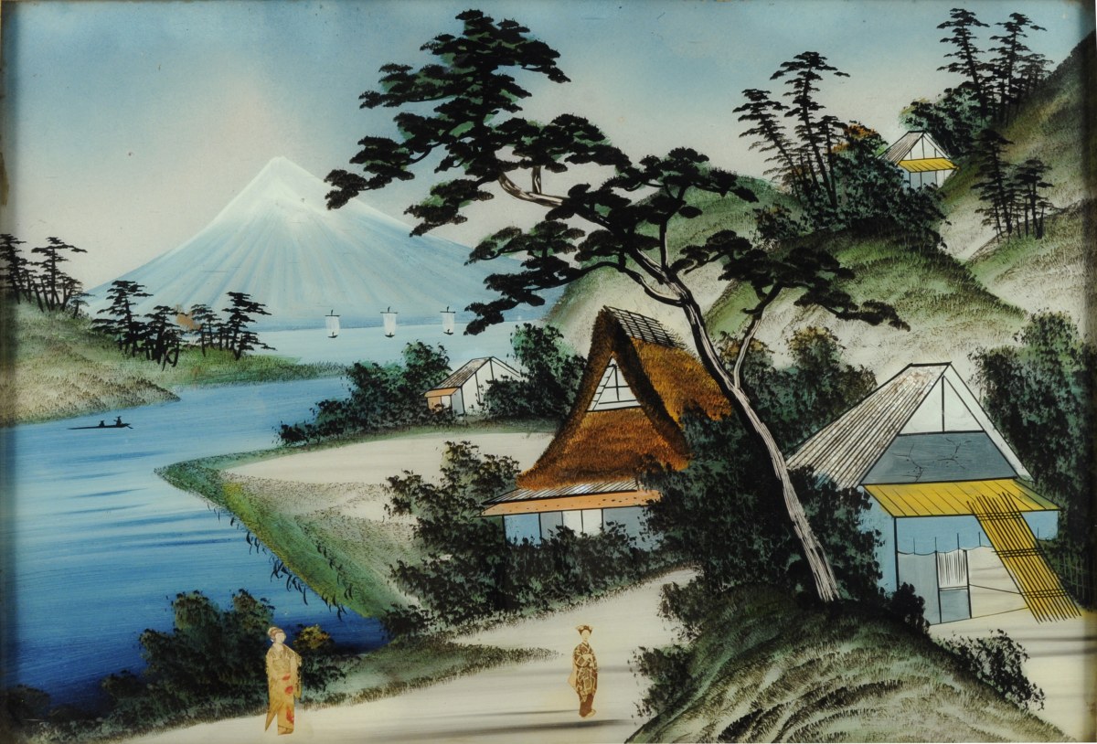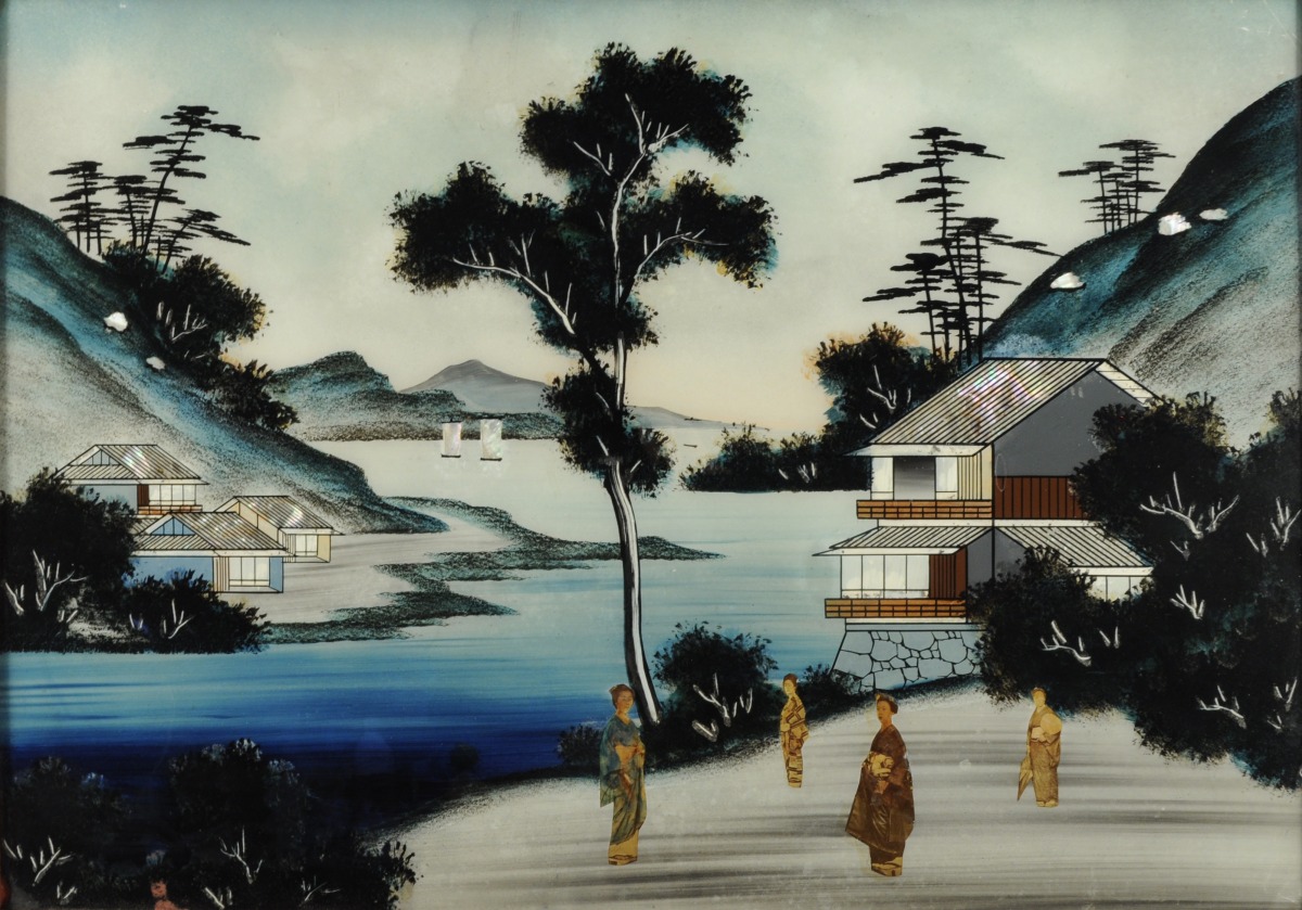 DEUX FIXES SOUS VERRES représentants un village au bord de l'eau animé de personnages. 34 x 50 cm.