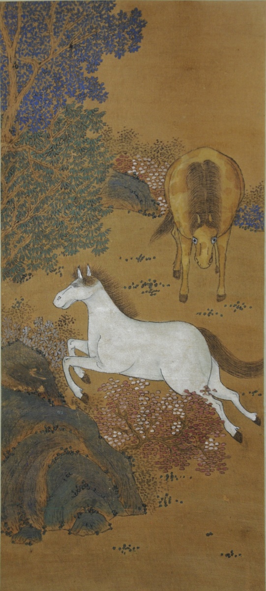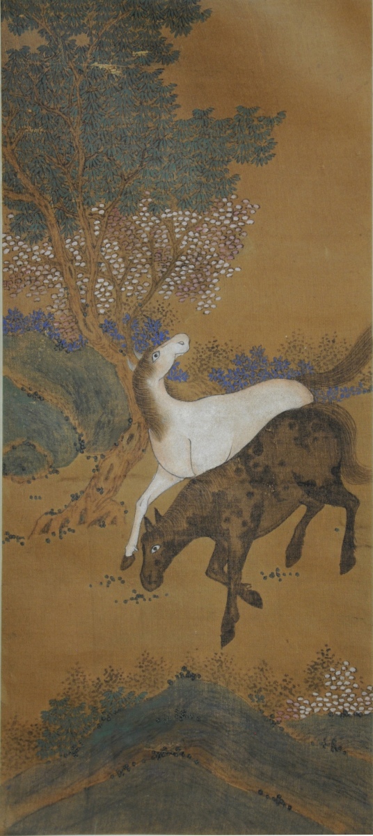 PAIRE de ROULEAUX à décor polychrome peint de chevaux dans un paysage. Chine, XXème. 127 x 35 cm. (déchirures)