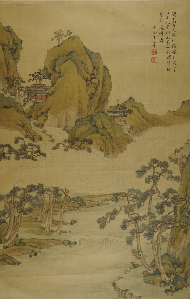 Peinture sur soie. Cachets rouges en haut à droite.