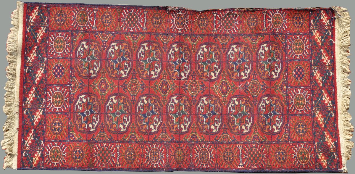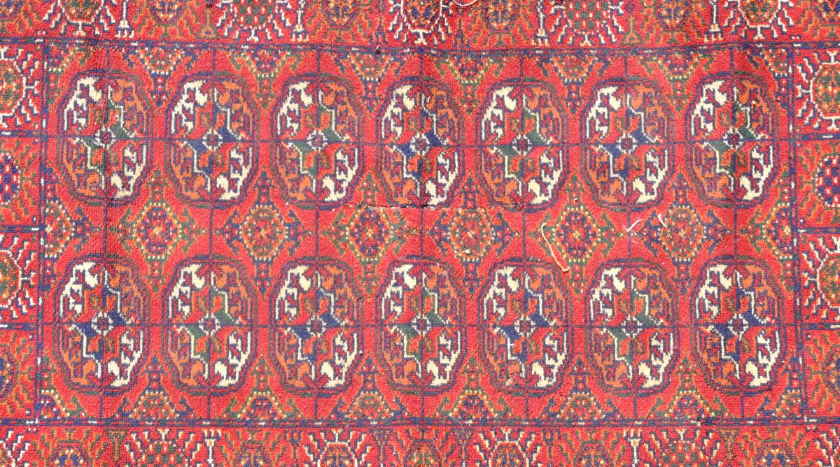 TAPIS Boukhara en laine à motif de gühls sur fond rouge. 140 x 70 cm. (accident)