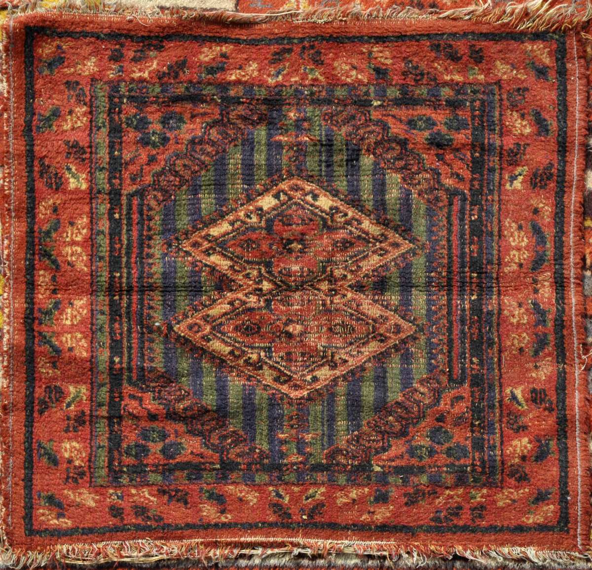 PETIT TAPIS en laine de style caucasien à motif de double médaillon losangique sur fond rayé vert et bleu. Bordure principale rouge. 66 x 62 cm. (usures)
