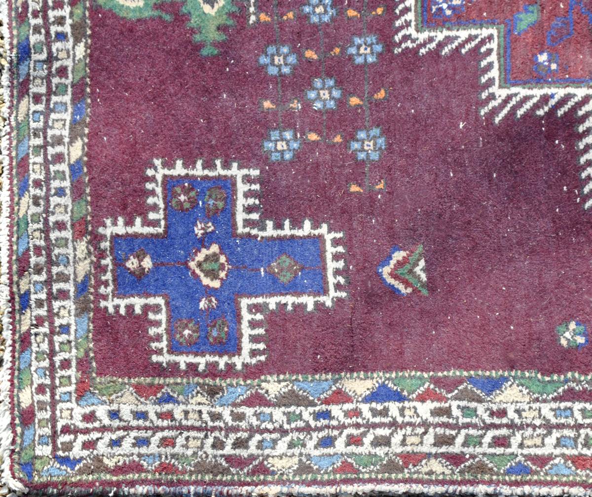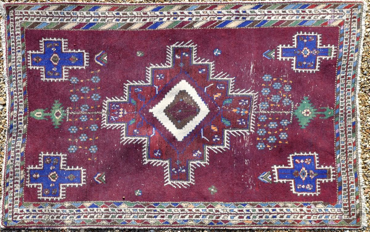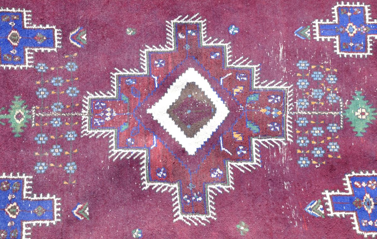 TAPIS kurde (?) en laine à motif de médaillon losangique sur fond lie de vin. 200 x 135 cm (usures)