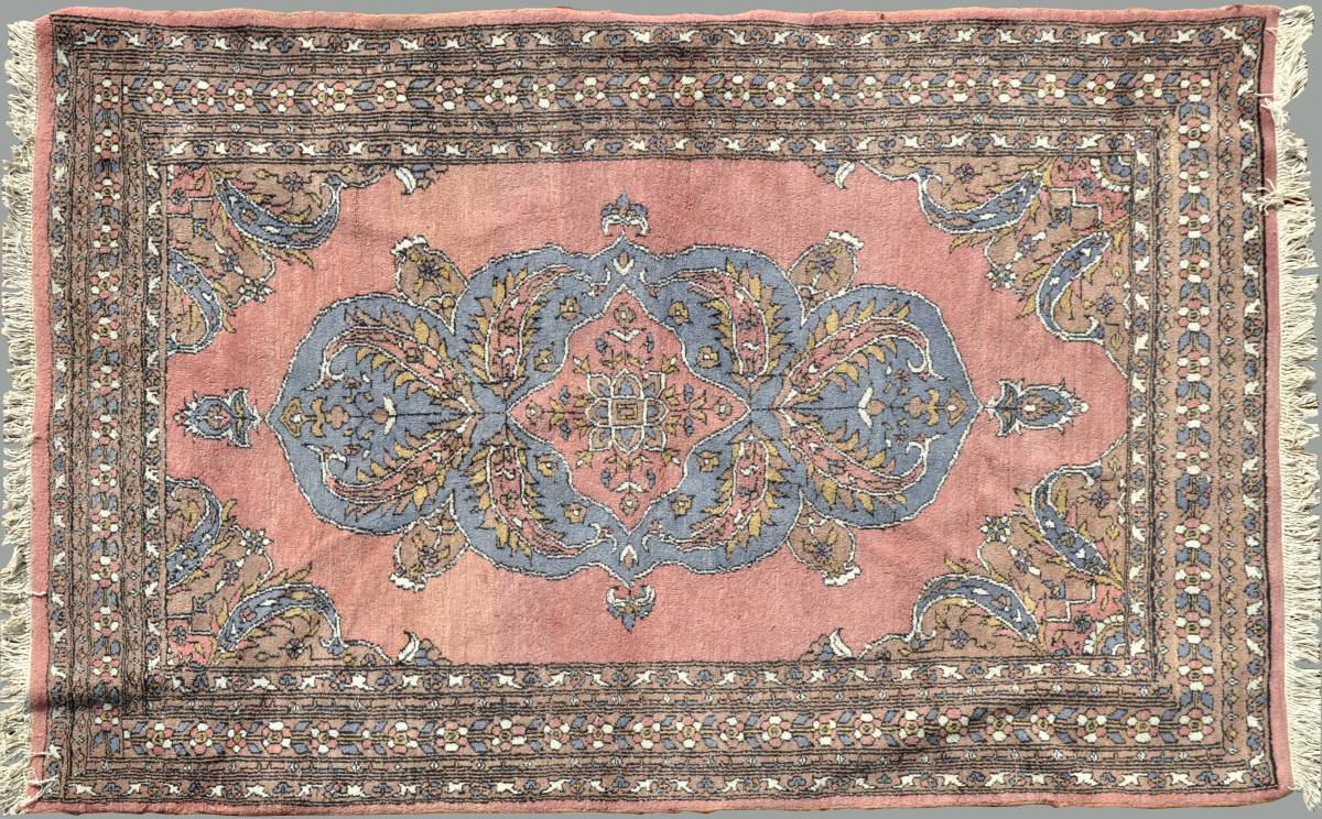 TAPIS d'Orient en laine à points noués, à décor persan, médaillon central bleu sur fond rose. 192 x130 cm.