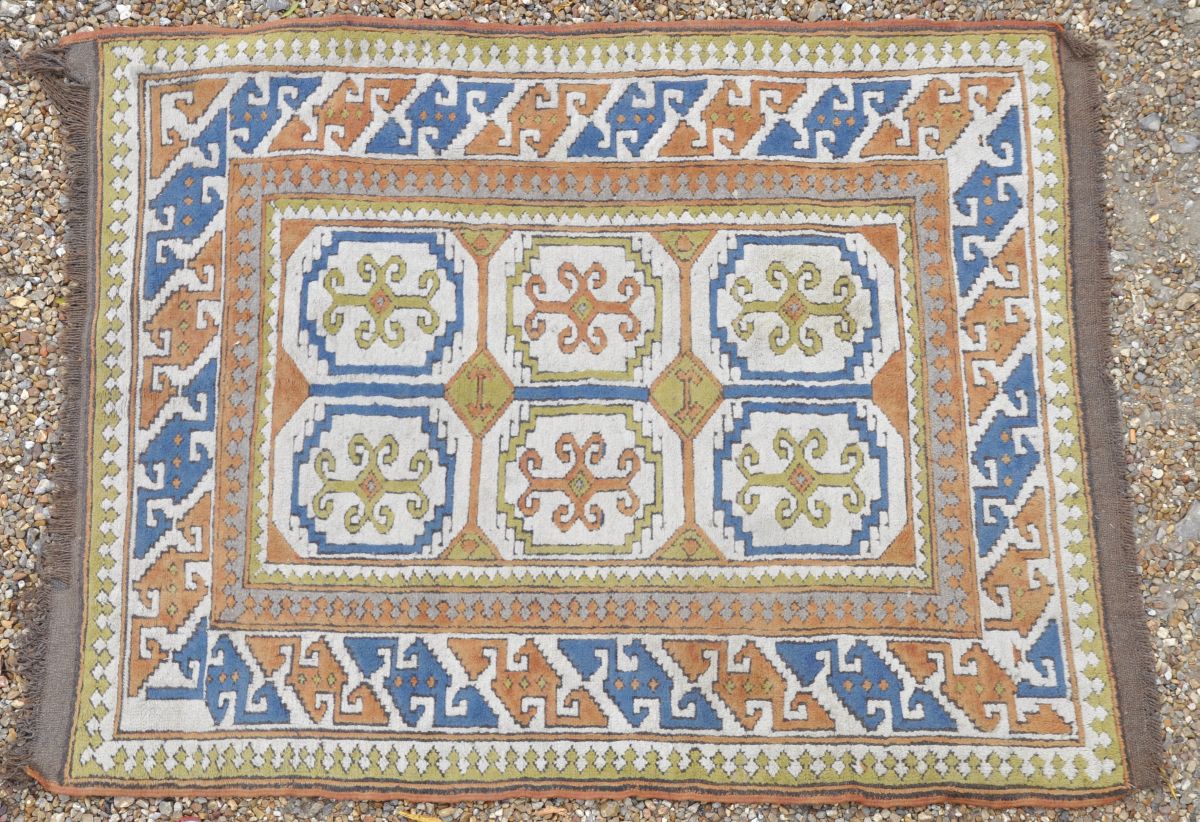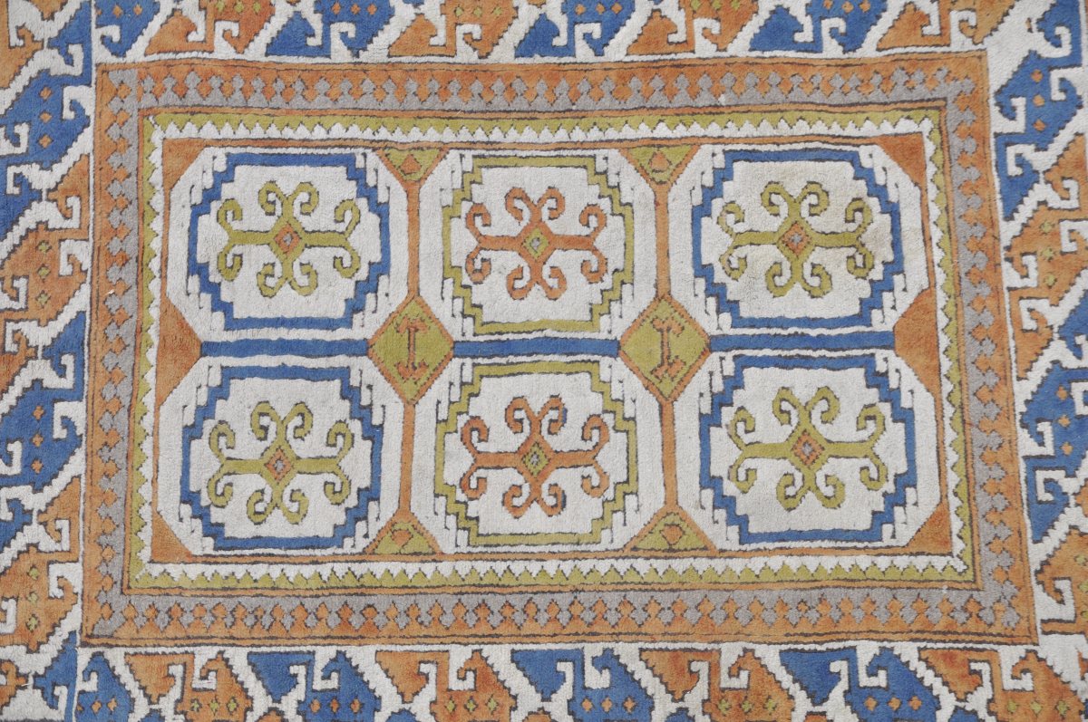 TAPIS de style caucasien en laine à points noués sur fond orange. Long. 173 Larg 133 cm.