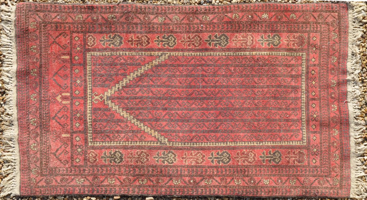 TAPIS de prière en laine à points noués à décor d'un mirhab, sur fond rouge, à bordures multiples. 85 x 141 cm.