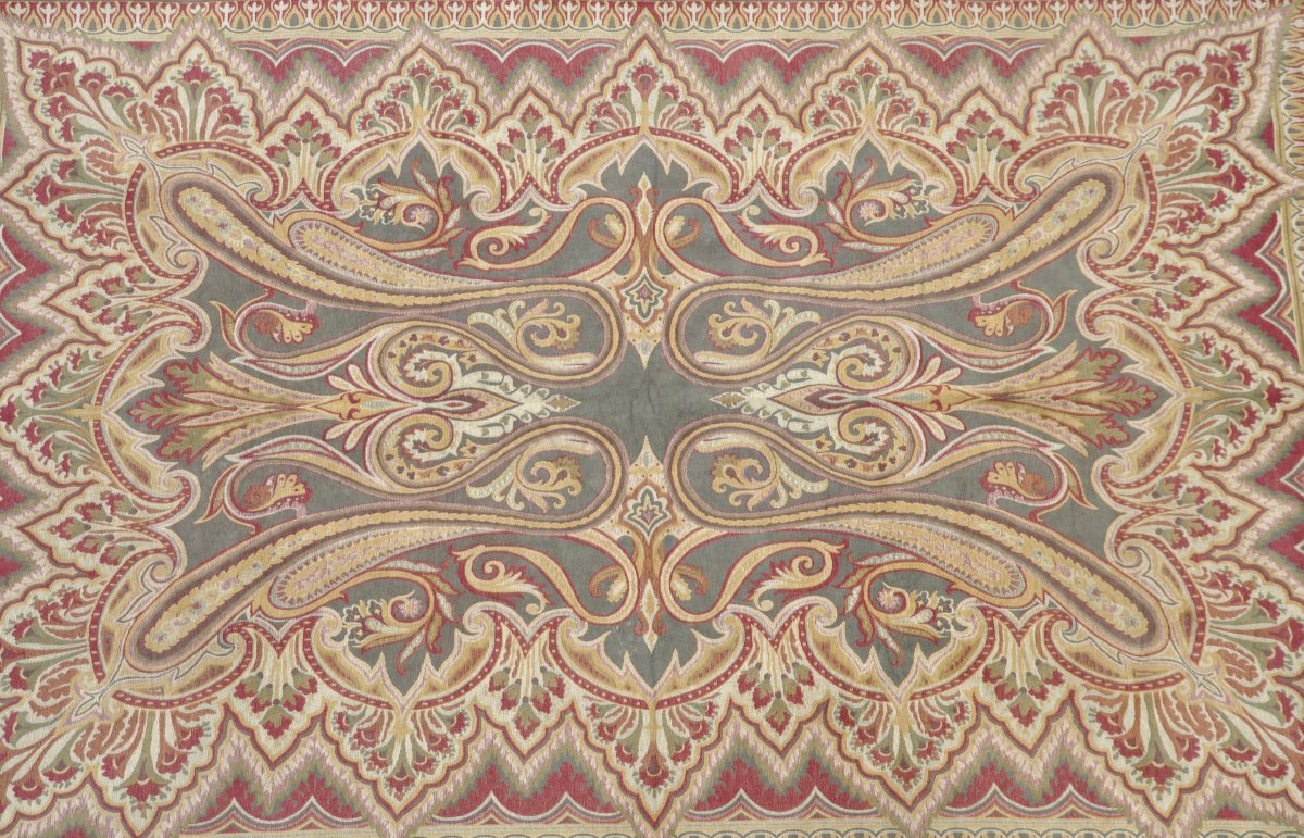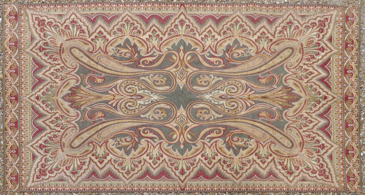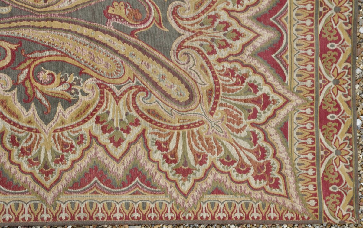 TAPIS mécanique en laine à motifs de quatre Boteh accolés, bordure de fleurs stylisées, sur fond vert et rouge, à effet velours. 300 x 177 cm.