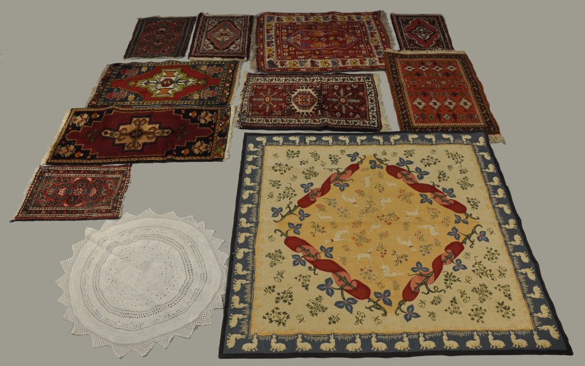 NEUF PETITS TAPIS en laine et une tapisserie à motif animalier en soie. Formats divers.