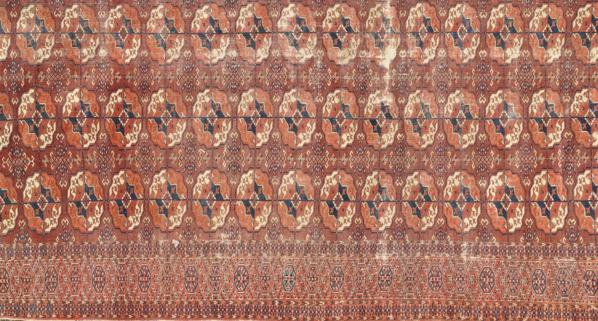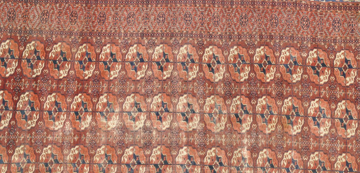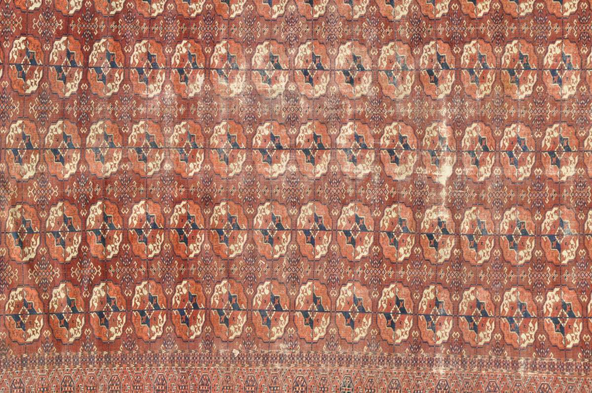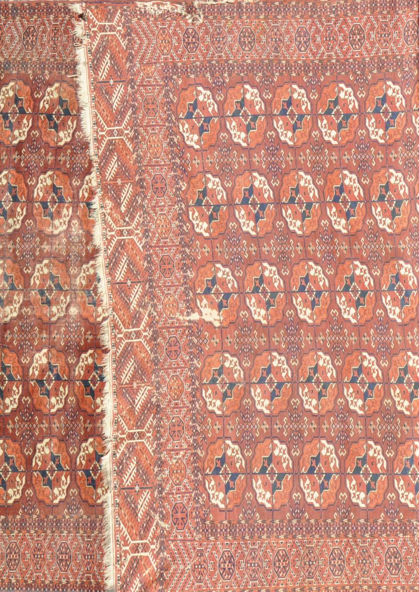 TAPIS Boukhara ancien en laine à motifs de gühl, frise géométrique. 422 x 268 cm. (accidents, manques, réparations).