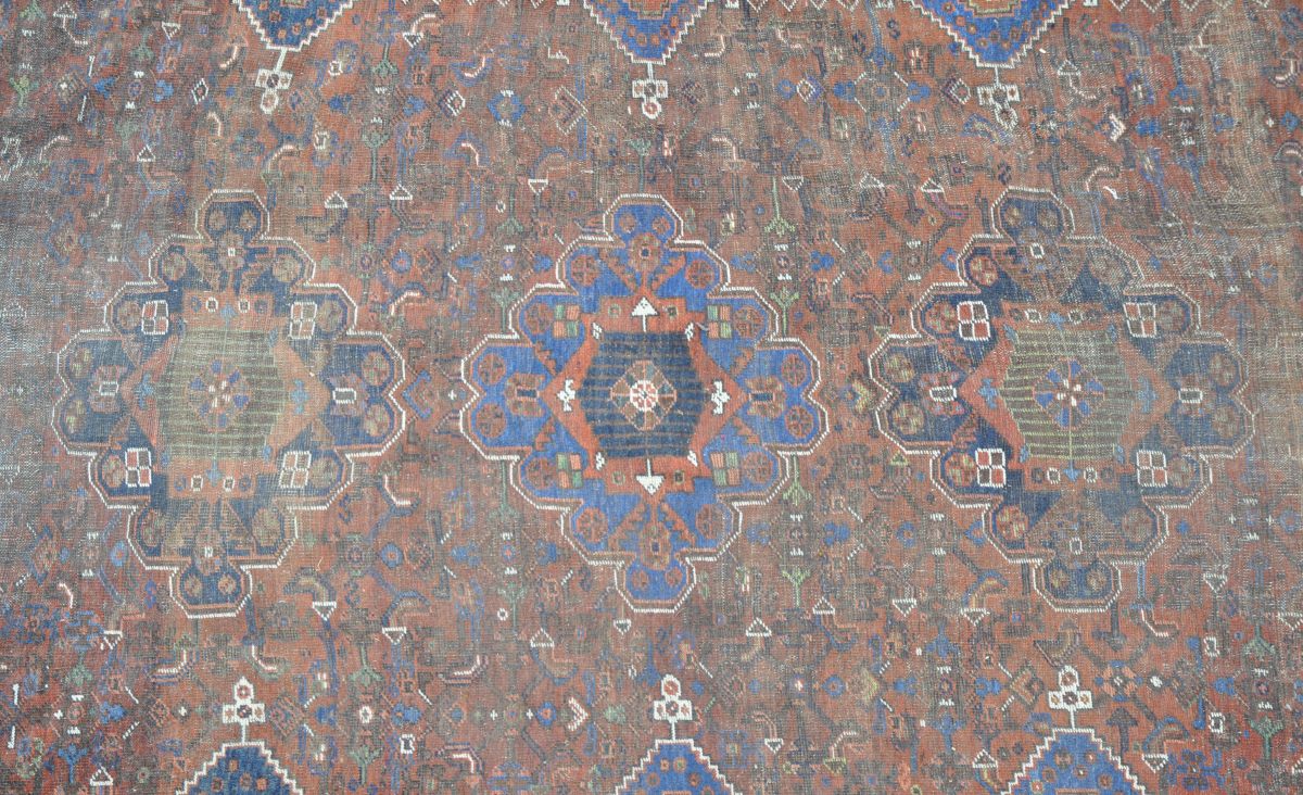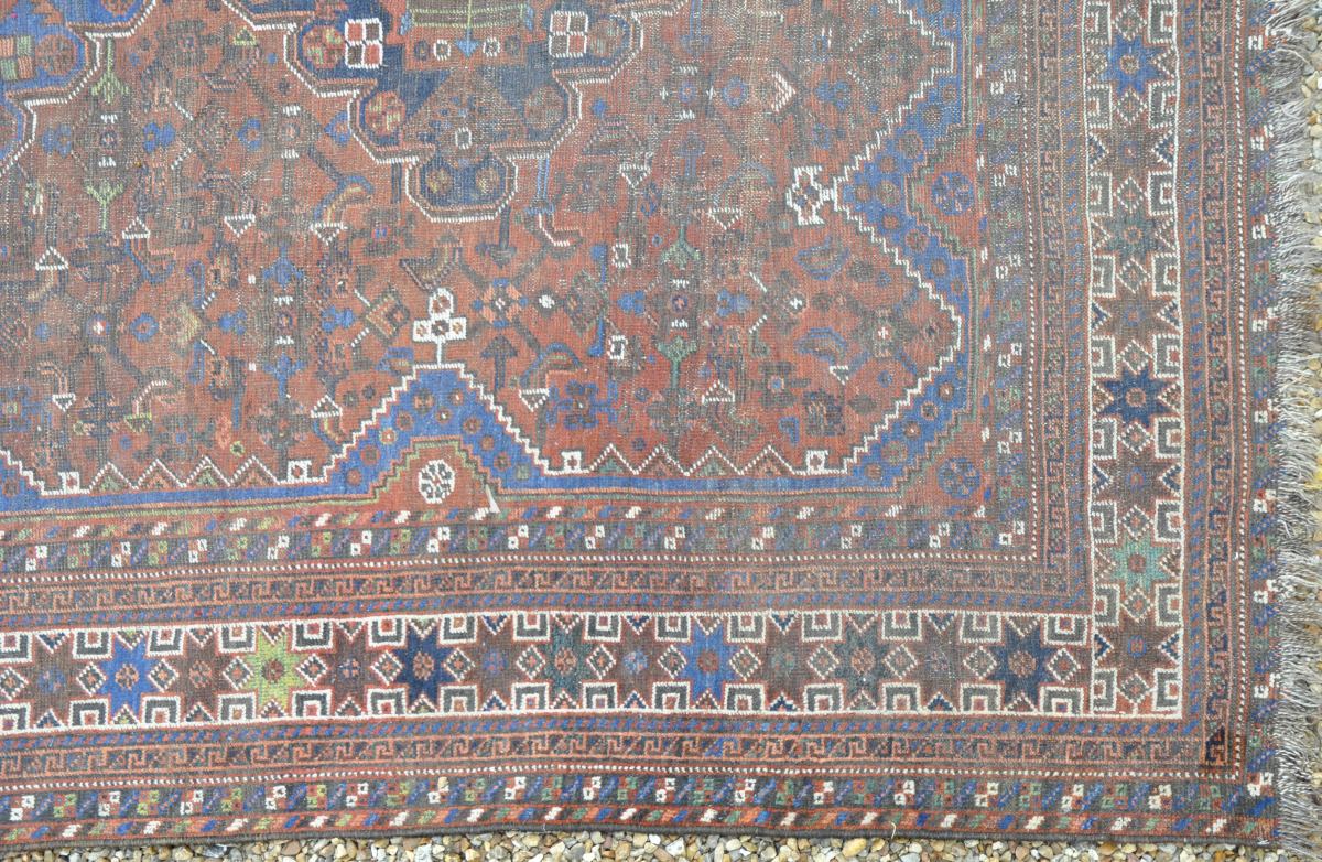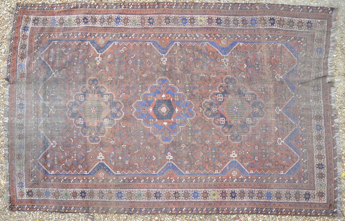 TAPIS d'Asie mineure en laine, à décor de trois médaillon sur fond lie de vin. 308 x 210 cm. (usures)