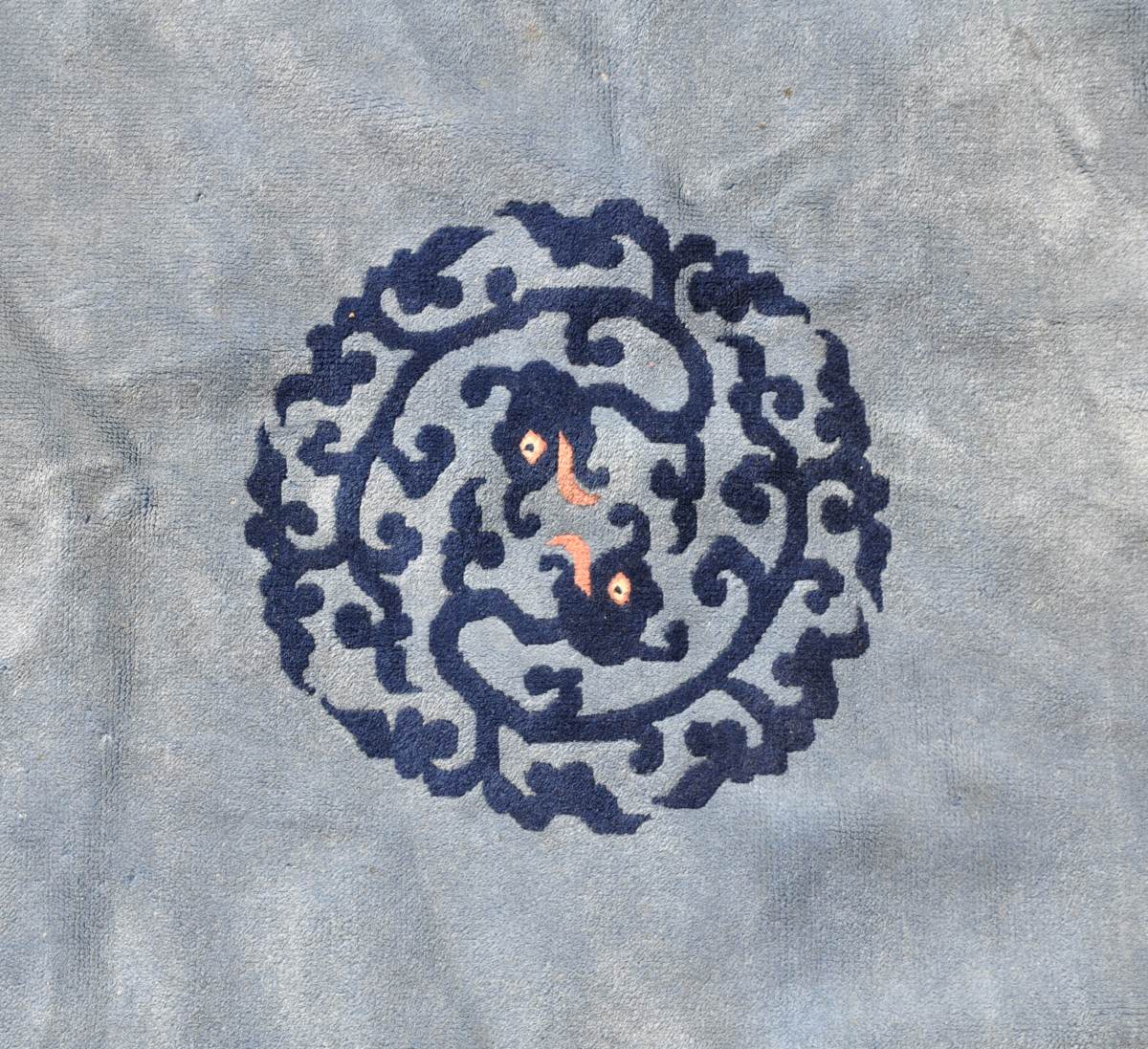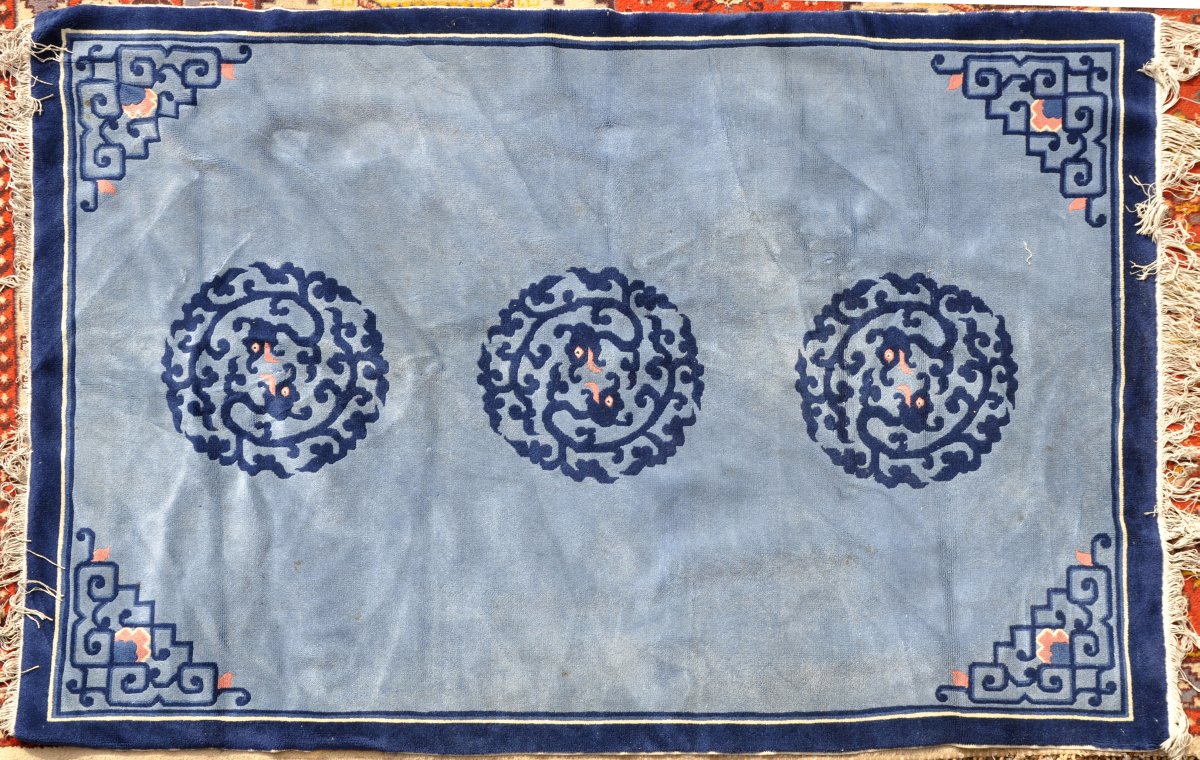 TAPIS de la Chine en laine à fond bleu à motif de dragons et feuillages stylisés. XXème. 200 x 141 cm.