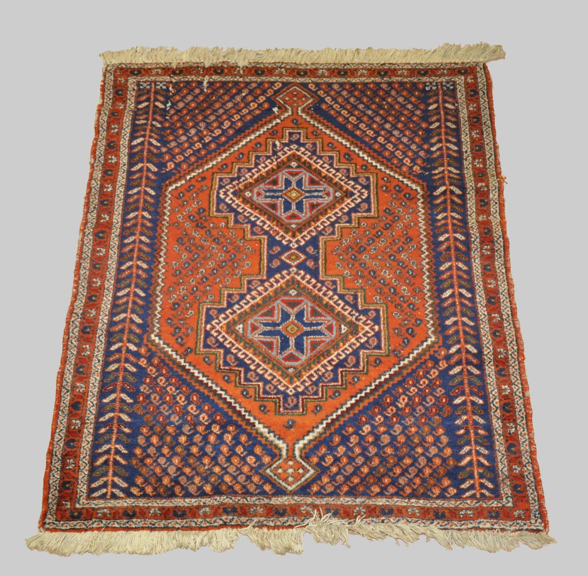 Petit TAPIS en laine à motif de deux médaillons dans un losange sur fond orangé. Iran, Senneh (?) 116 x 90 cm.