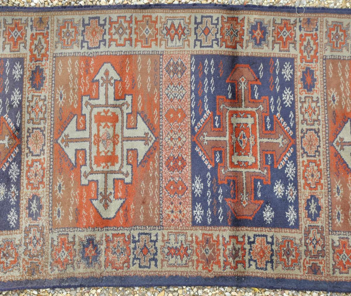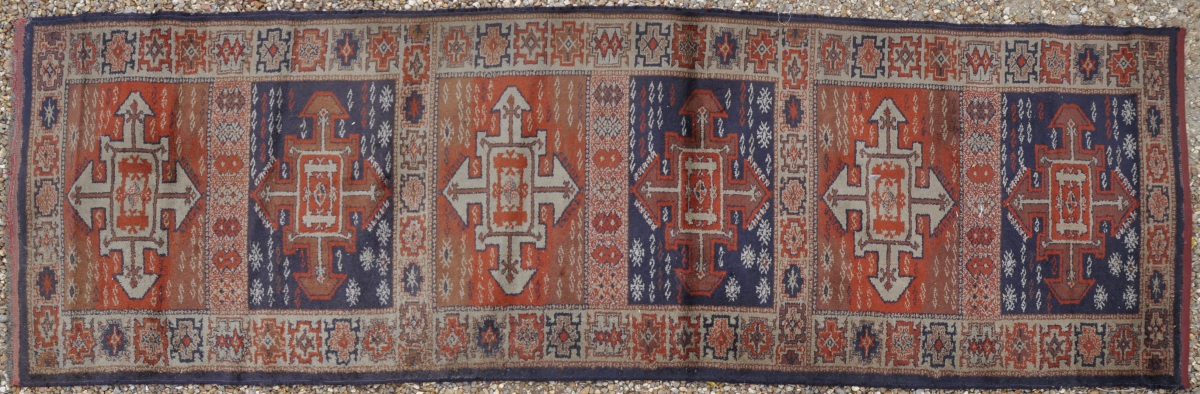 GALERIE Kazak (?) moderne en laine à motif de six médaillons sur fond alterné bleu et rouge. Bordure à motif de médaillons. 290 x 96 cm.