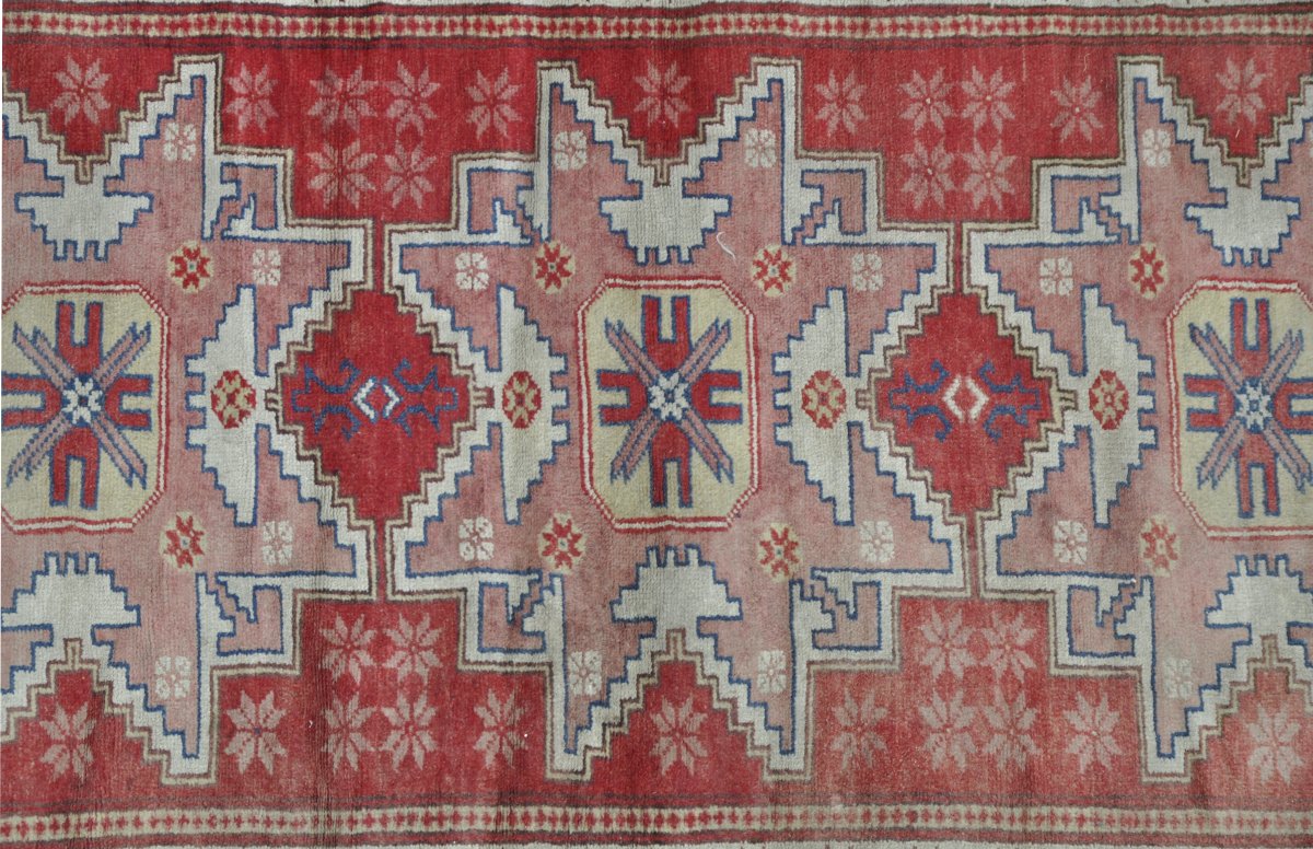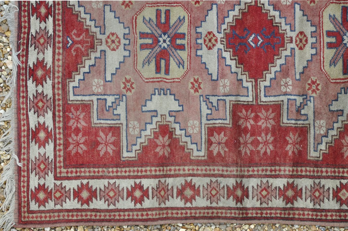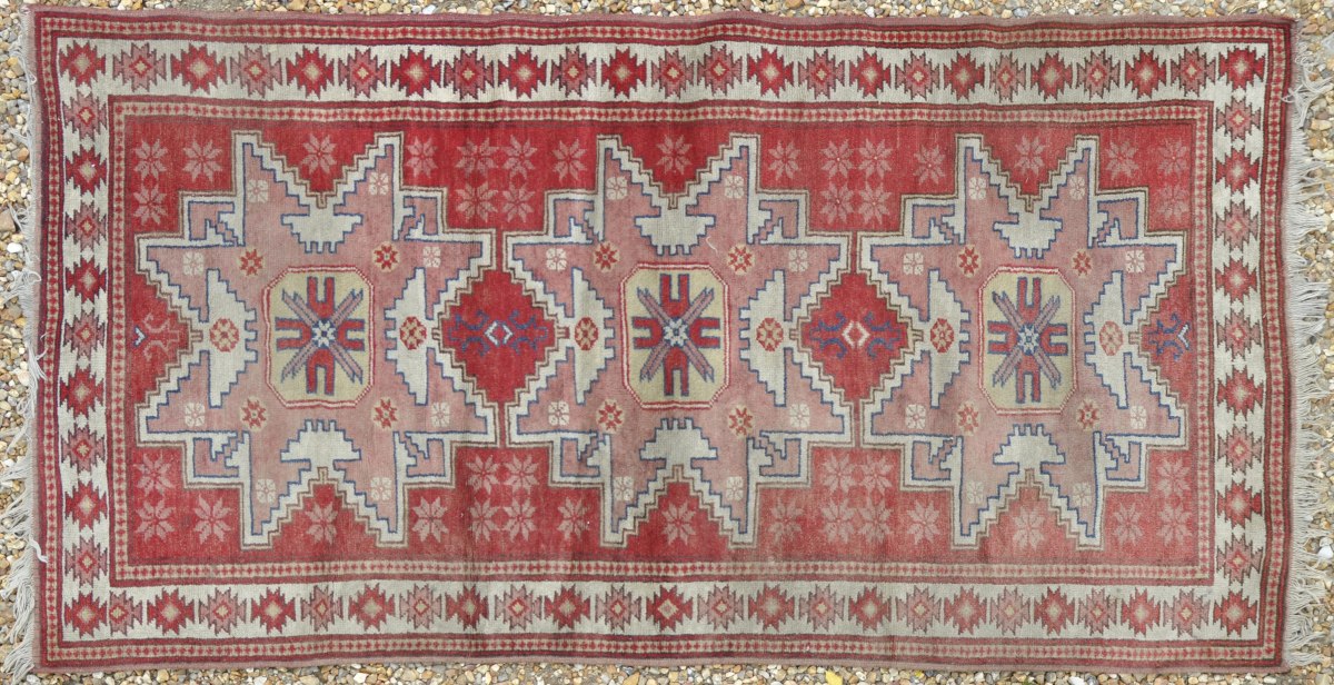 TAPIS Kazak (?) moderne en laine à motif de trois médaillons étoilés sur fond rouge. Bordure à motif de médaillons sur fond crème. 187 x 105 cm.