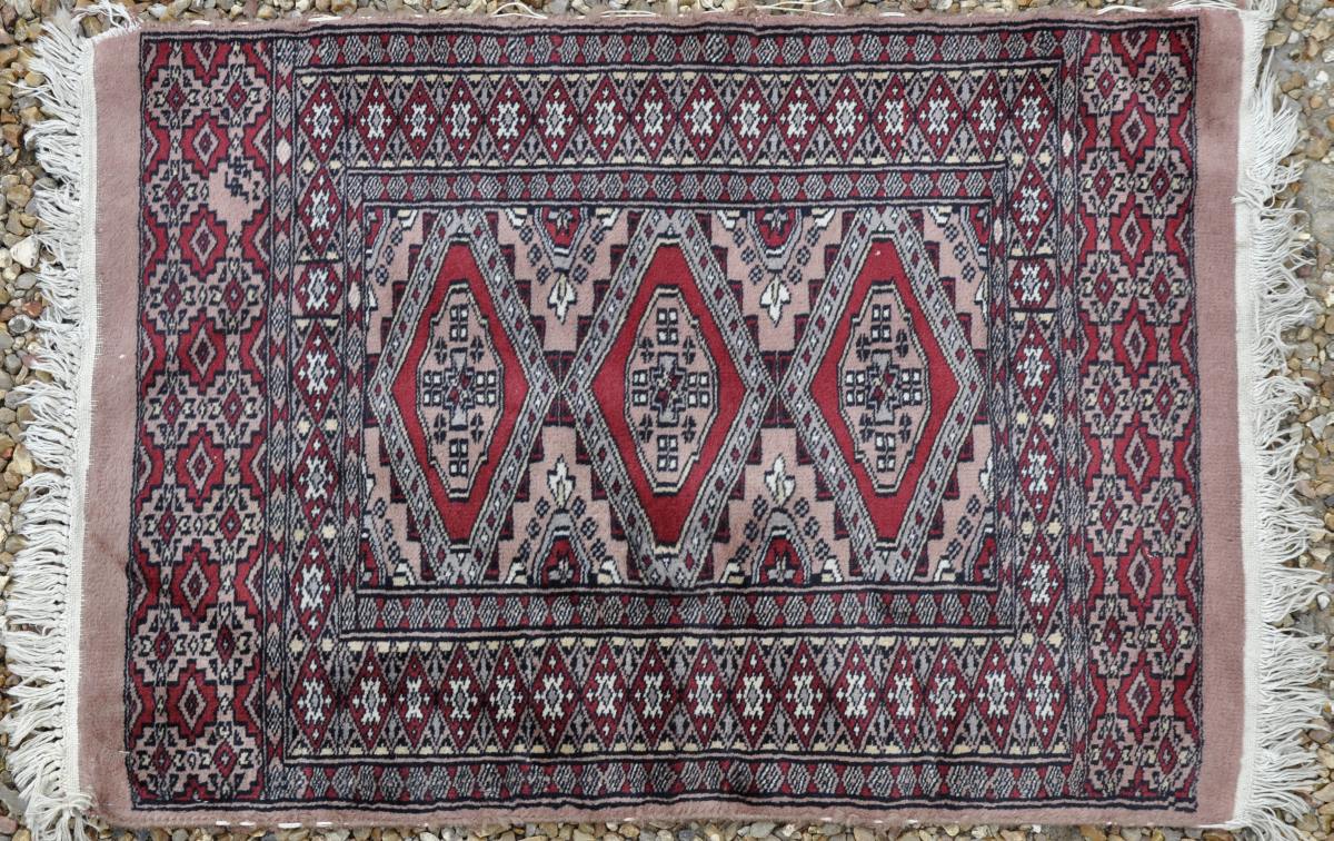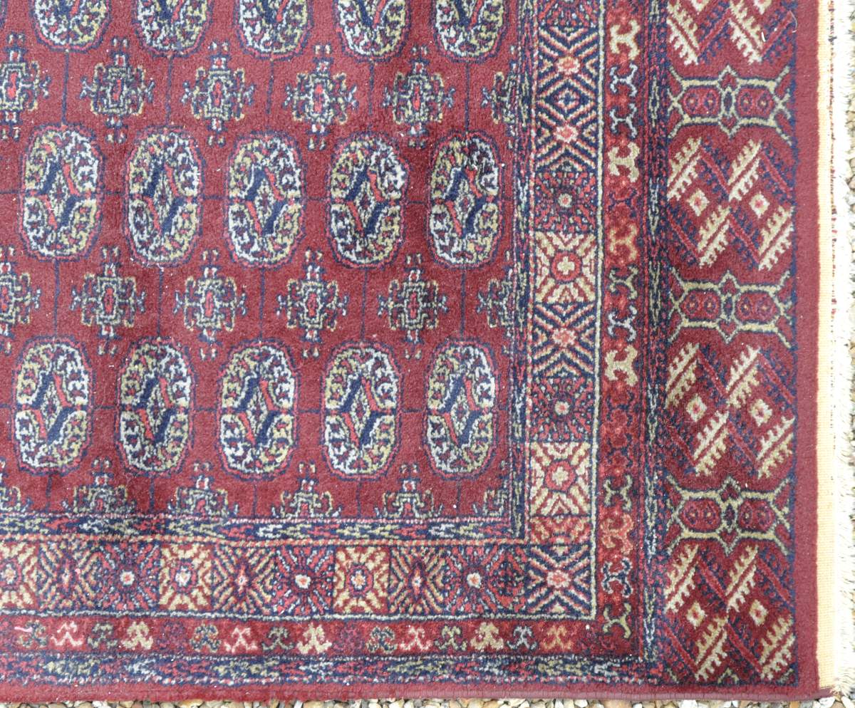 TAPIS Boukhara en laine à motif de gühls sur fond rouge. Bordure principale à motif de médaillons. 203 x 131 cm.