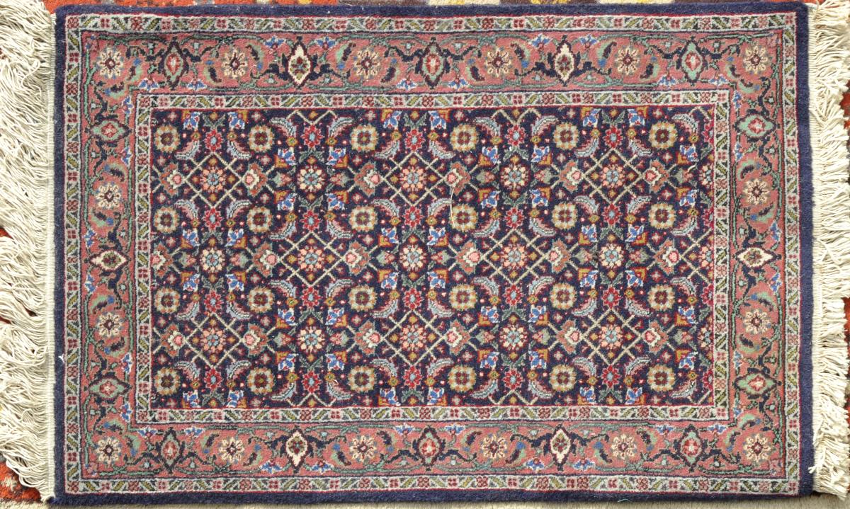 JOINT : DEUX PETITS TAPIS modernes en laine. L'un à fond noir, l'autre à fond rouge. 83 x 56 et 90 x 60 cm.