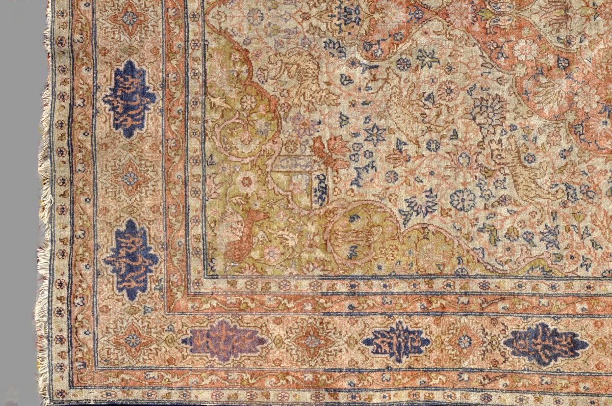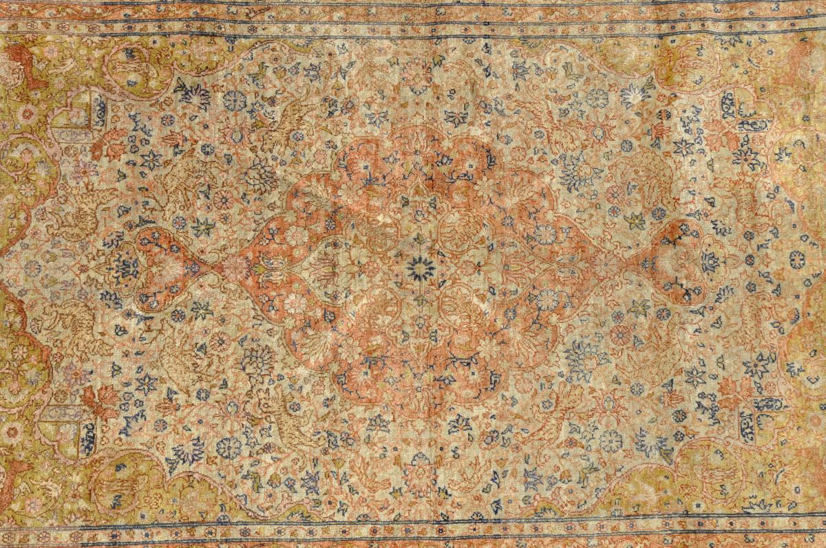 TAPIS d'Ispahan, Iran, à motif de médaillon sur fond crème. Champ à motif floral animé d'animaux. Bordure principale à fond crème à motif de médaillons alternés portant des inscriptions. 202 x 130 cm. (usures, décoloration)