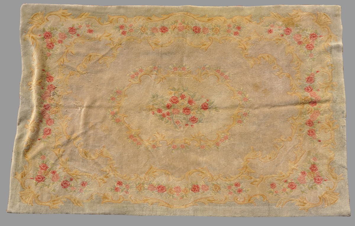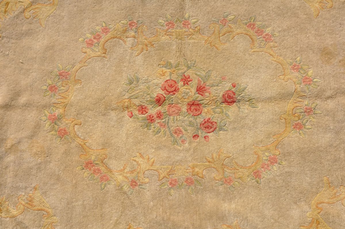 TAPIS de la Chine (?) en laine à fond beige à motif de fleurs et rinceaux dans le style Louis XV. 237 x 167 cm. (usures)