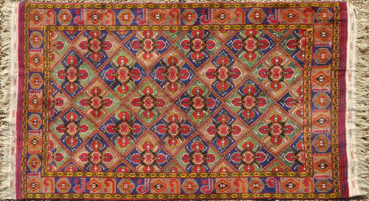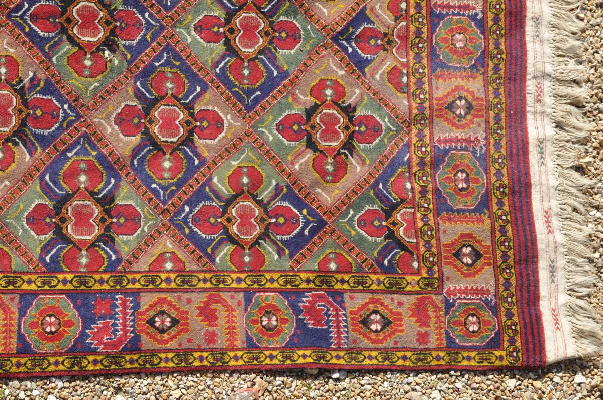 TAPIS d'Iran en laine à motif de treillage fleuri sur fon rouge. Bordure principale à motif de médaillons octogonaux alternés de crosses. 280 x 181 cm.