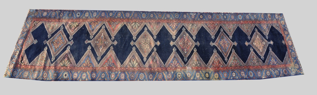 GALERIE d'Asie mineure en laine à motif de médaillons losangiques dans une réserve sur fond bleu. Bordure principale à motif floral sur fond bleu. 490 x 107 cm