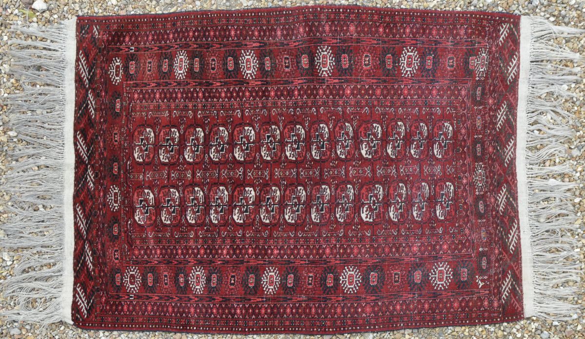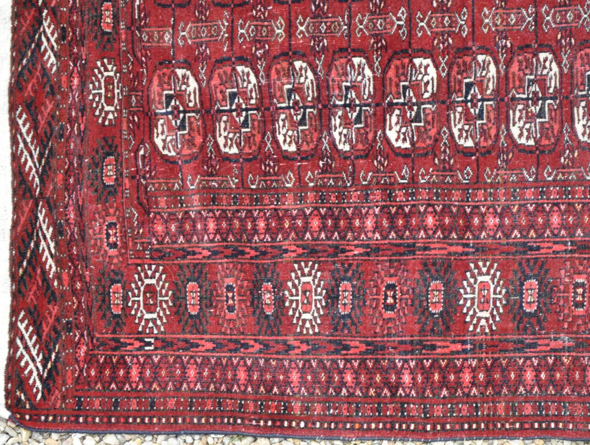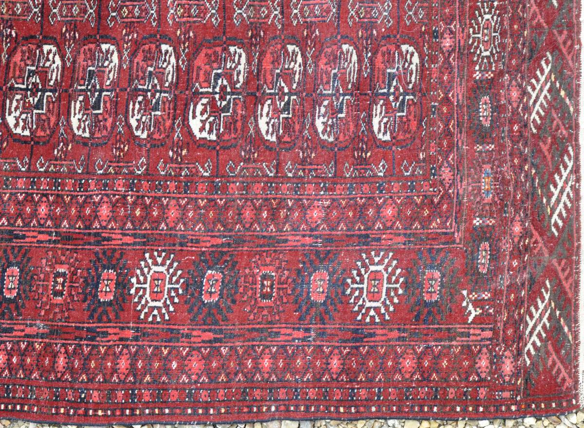 TAPIS Boukhara à motifs de gühls sur fond rouge. La bordure frangée. 150 x 111 cm.