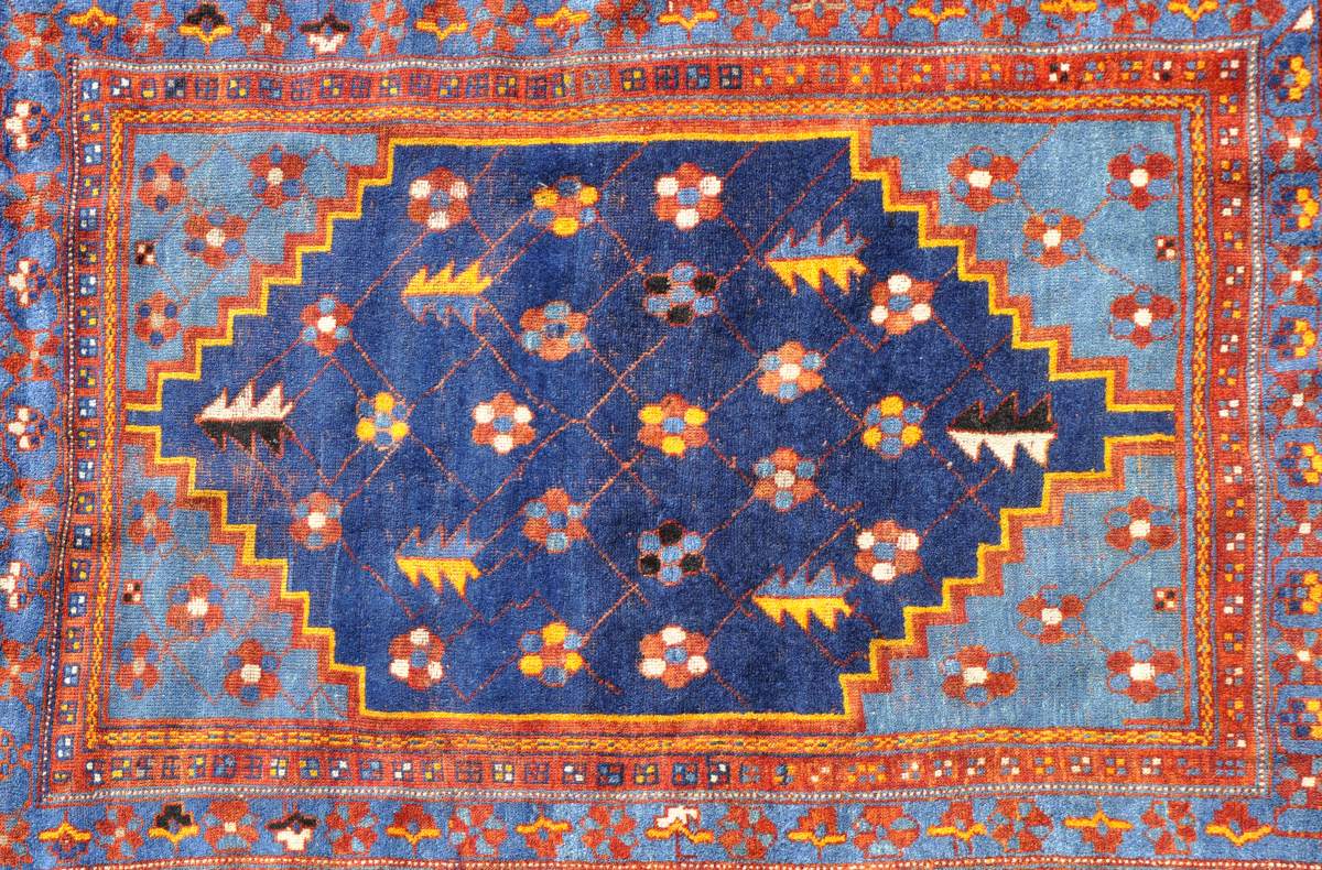 TAPIS du Caucase à motif de médaillon losangique bleu nuit sur fond bleu ciel. Bordure principale à motif floral sur fond bleu ciel. 205 x 149 cm.