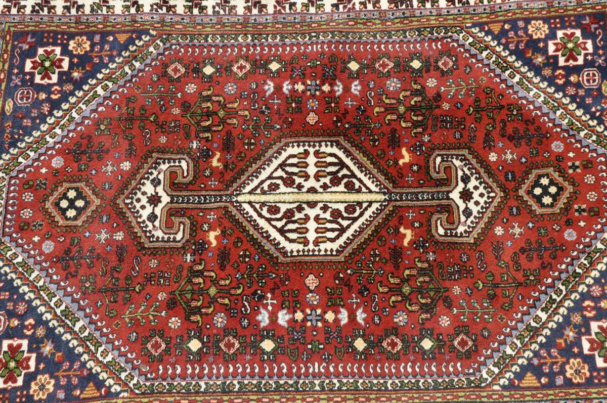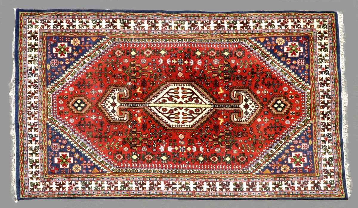 TAPIS d'Asie Mineure en laine à motif de médaillon losangique sur fond rouge. Champ bleu nuit à motif floral. Bordure principale à motif floral sur fond crème. 300 x 207 cm.