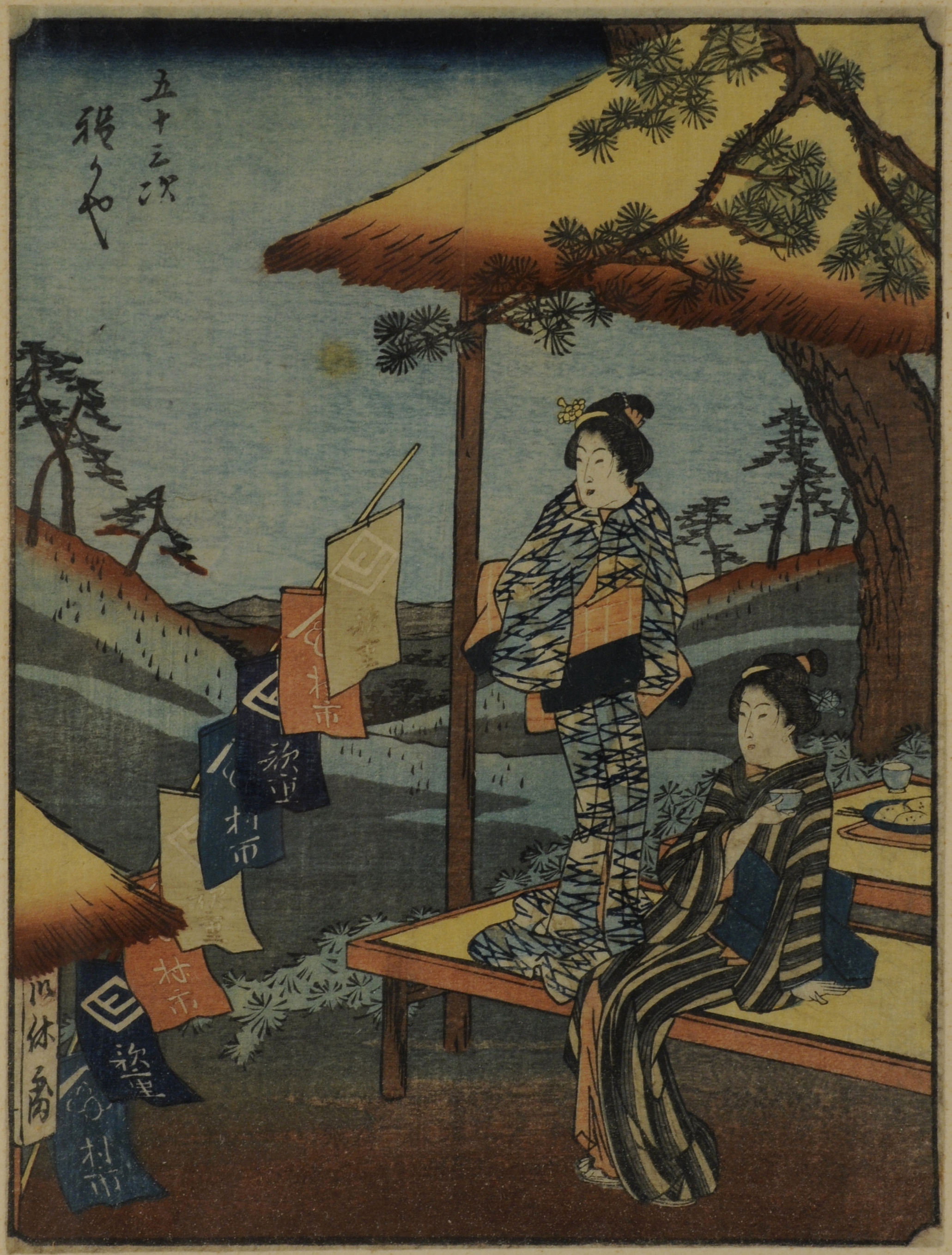 ESTAMPE figurant deux femmes prenant le thé en admirant des fanions colorés portants des inscriptions. Série des 53 stations du Tokaido. Caractères japonais en haut à gauche. 22 x 17 cm. (petit format)