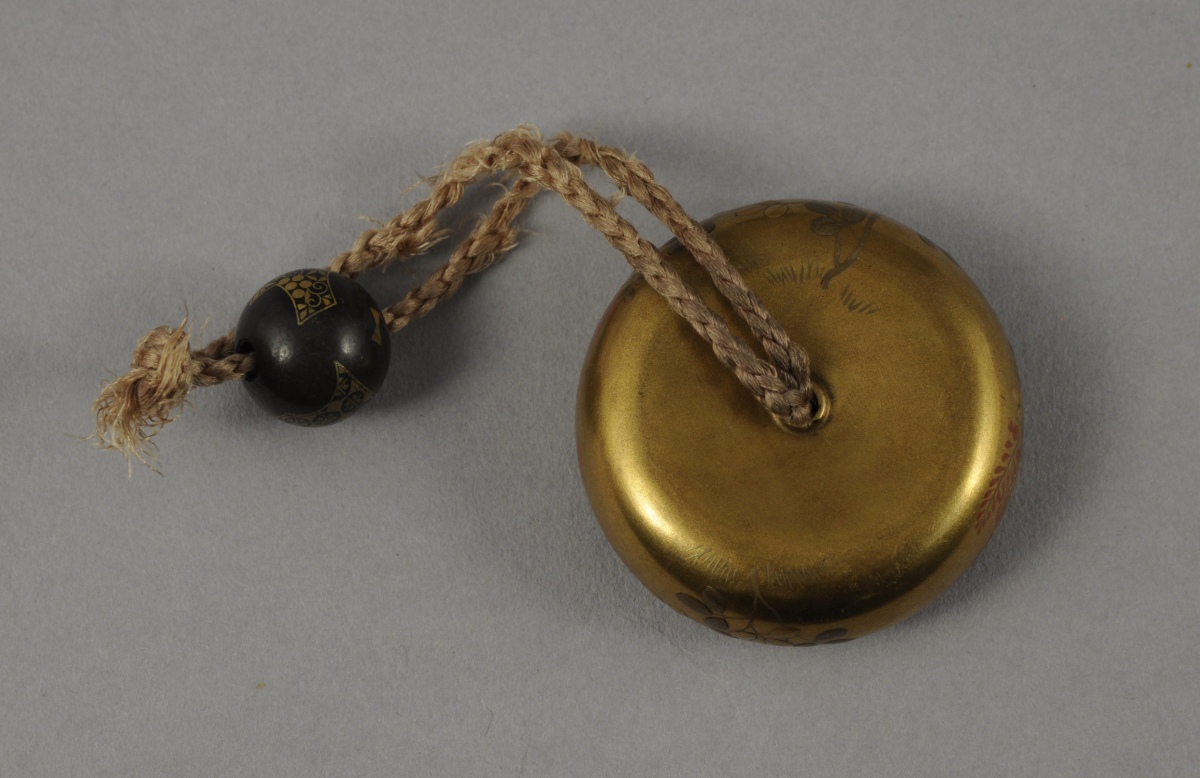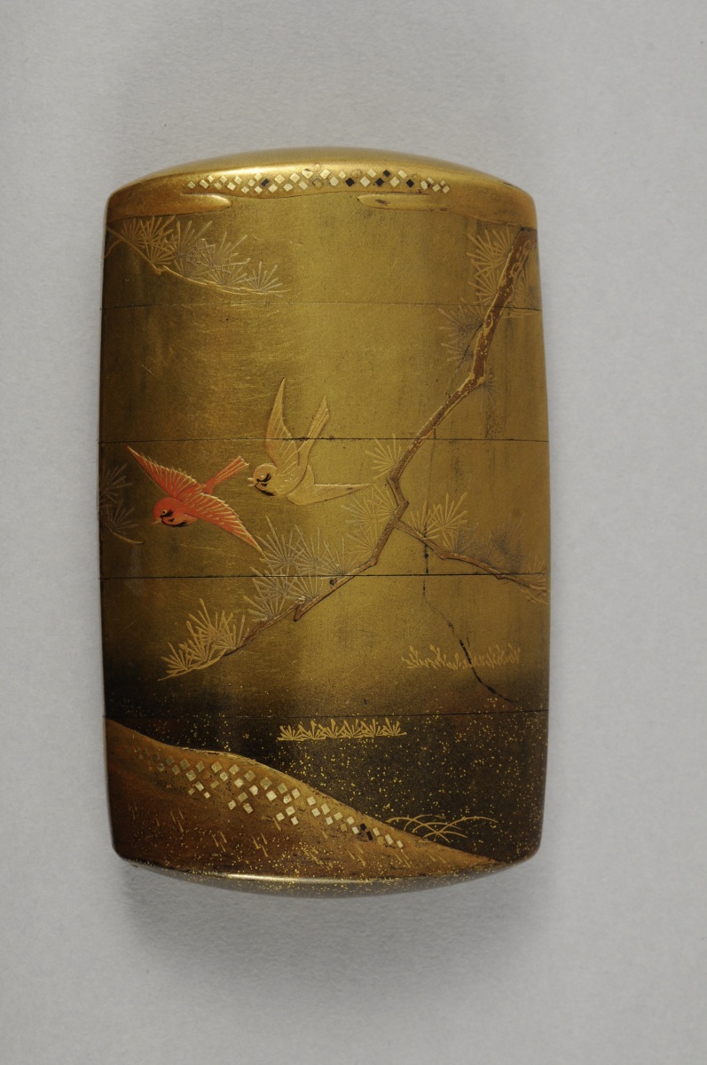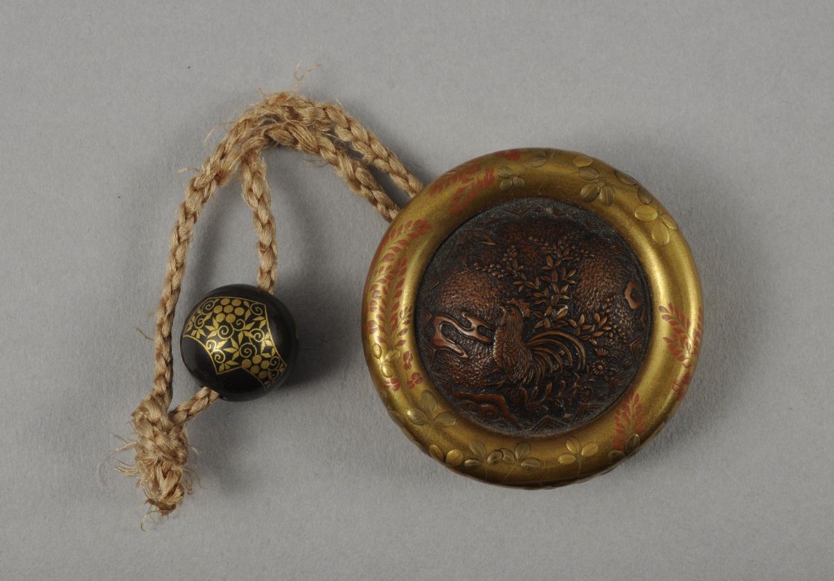 INRO laqué or à cinq compartiments : la chasse au faucon. Signé. Son bouton orné d'un coq. Japon, XIXème. Inro : Haut. 9, Larg. 5,5 cm. Diam bouton : 4,2 cm. (petit accident au trou de la corde et rayure)
